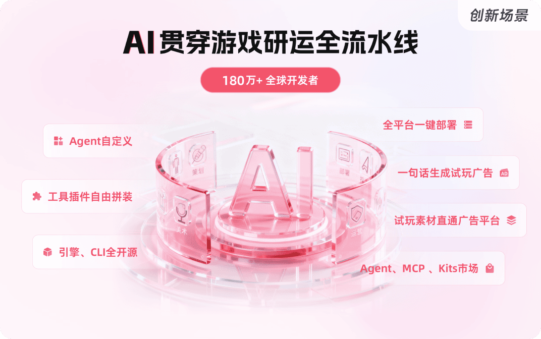 PinK使用豆包大模型,打造全新的开发者工具,全面支持AI Coding,内置大量AI Native Kit、Agent、MCP等插件生态,将游戏开发周期从“数周”压缩至“数小时。