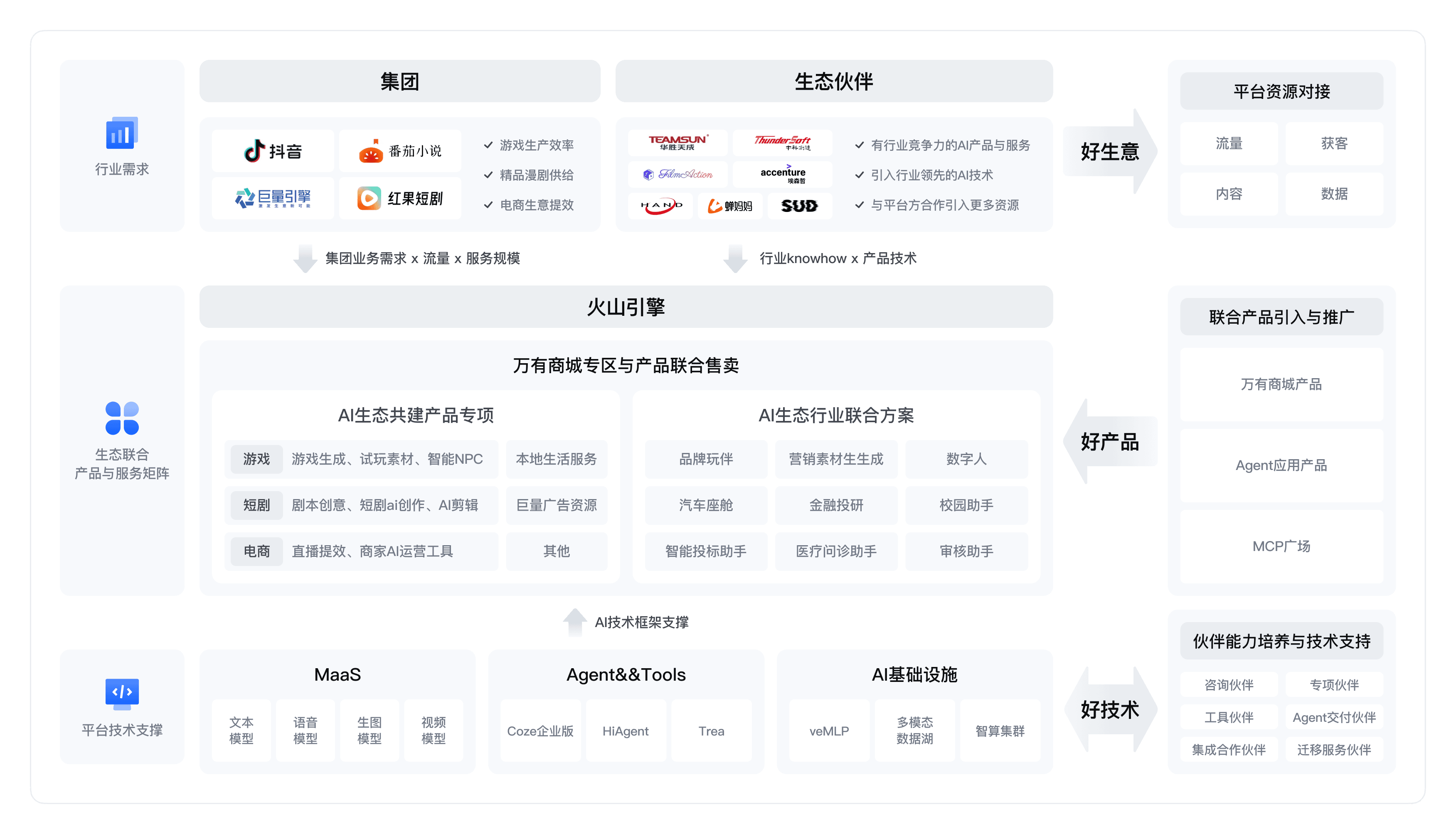 火山引擎生态以 AI 技术为核心驱动力,打造 “技术 + 流量 + 场景” 开放生态,覆盖多领域。我们开放底层 AI 技术、整合集团核心优势,依托三位一体生态战略,携手共拓 AI 时代新机遇。