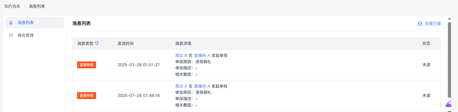 在消息列表页面,查看举报消息详情,即举报提交时间、举报人、被举报的直播间、举报原因、详细的违规理由和截图证据。