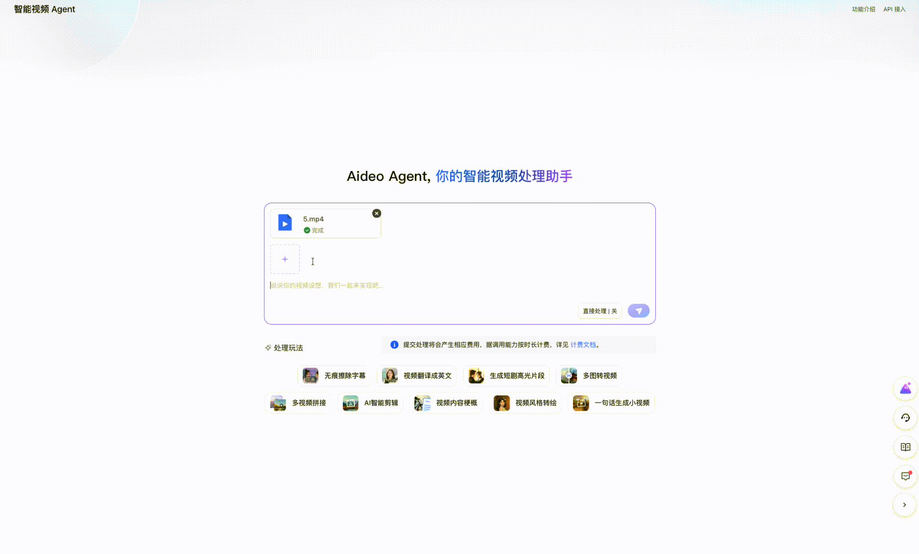 Aideo Agent 将一系列视频 AI 原子能力封装为易于调用的工具。您只需通过自然语言,即可驱动这些 AI 工具,高效完成各类视频处理任务。