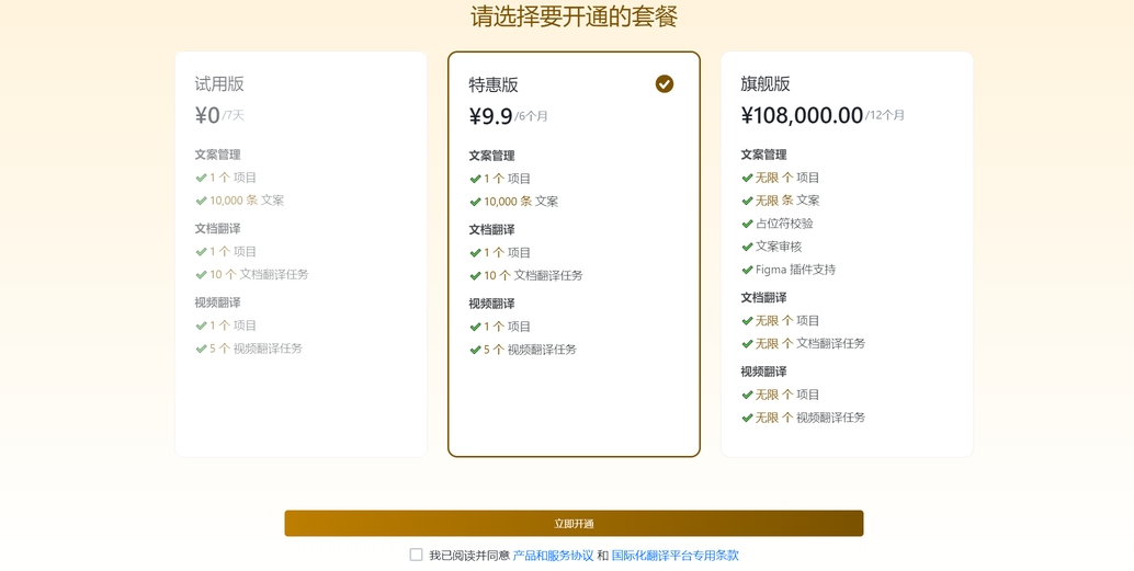 特惠版: 如果您是国际化翻译平台的新用户,支持购买产品特惠版,以更长时间体验产品功能。