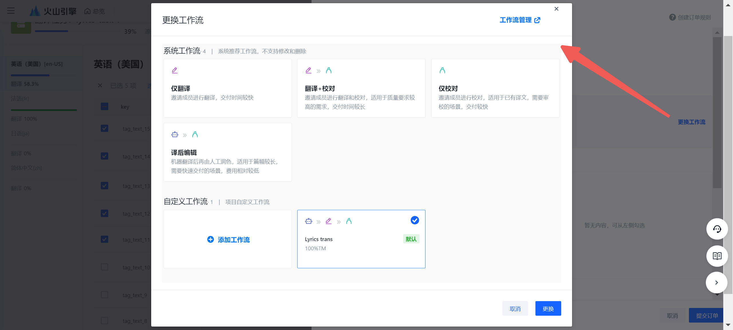用户还可以从「系统工作流」中更换合适的翻译/校对流程: