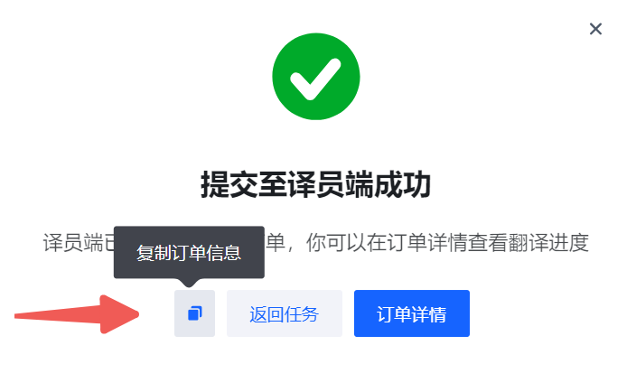 点击右上角的复制订单信息图标(❐),可一键复制该订单下所有子任务订单信息,包括项目名称、翻译流程、订单ID、目标语言。