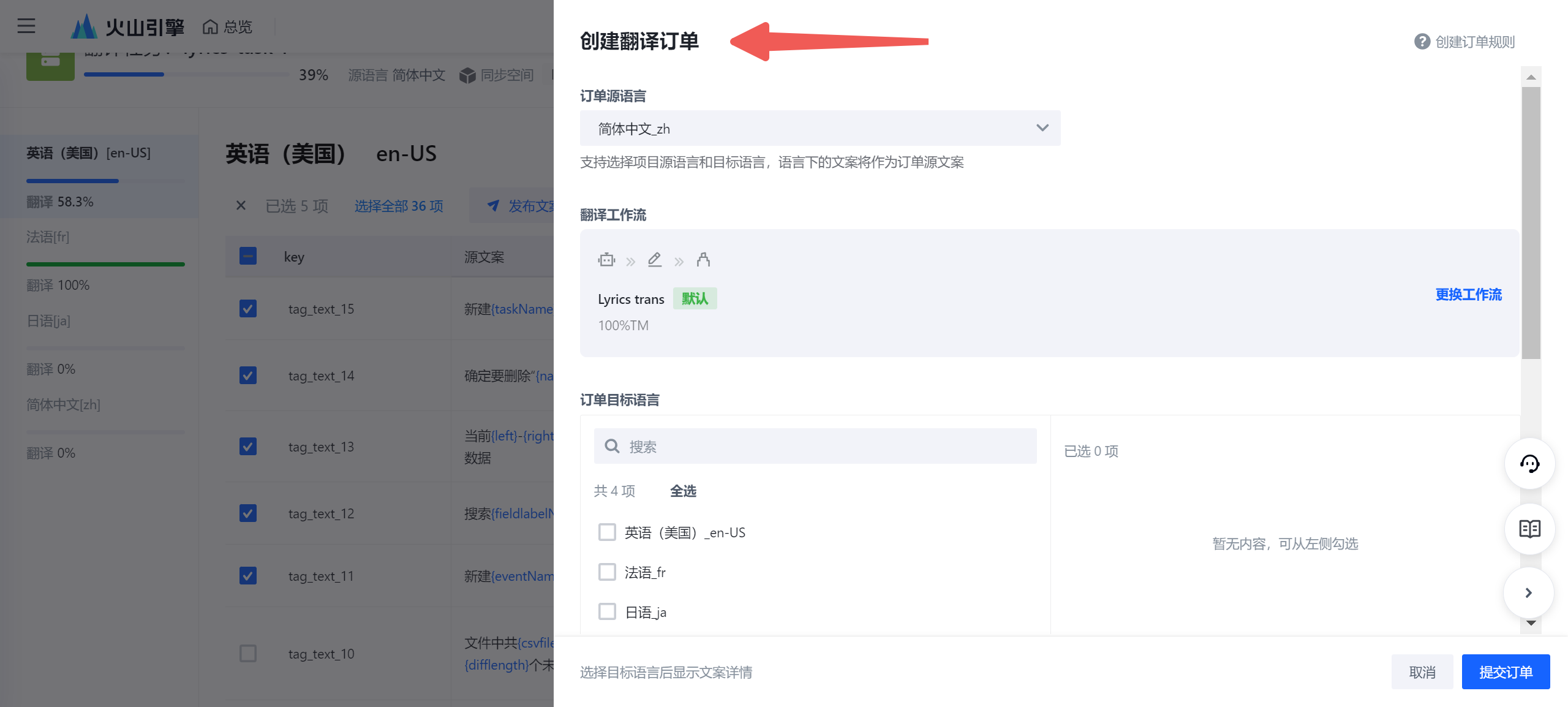 从文案视图创建翻译订单