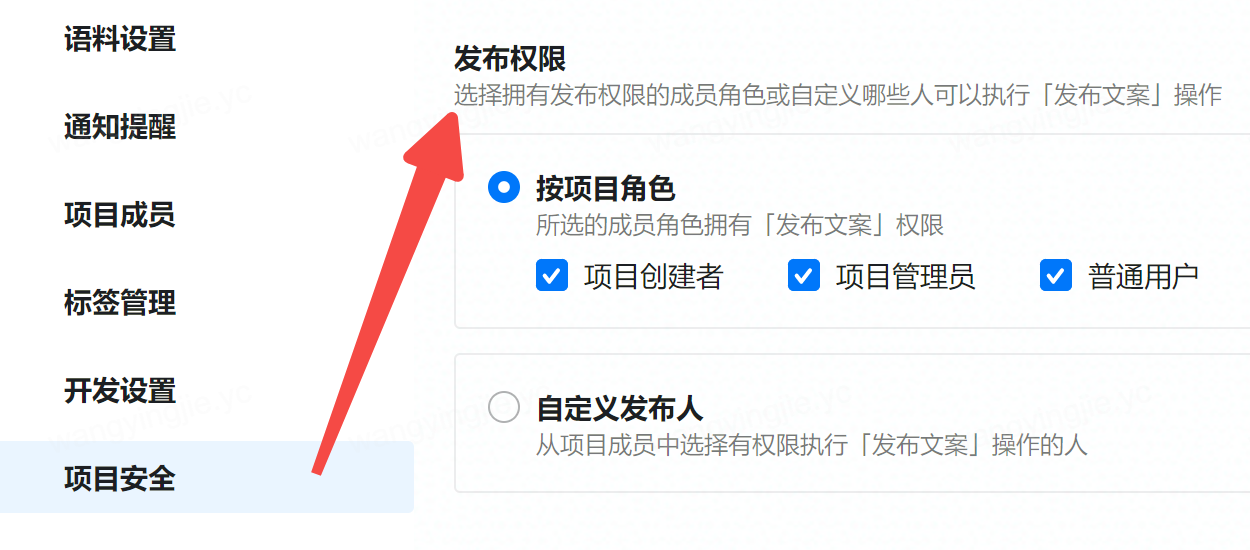 发布人可以对一个项目下的文案进行发布,在项目设置 - 项目安全中,可以选择按角色配置发布权限,或自定义发布人。