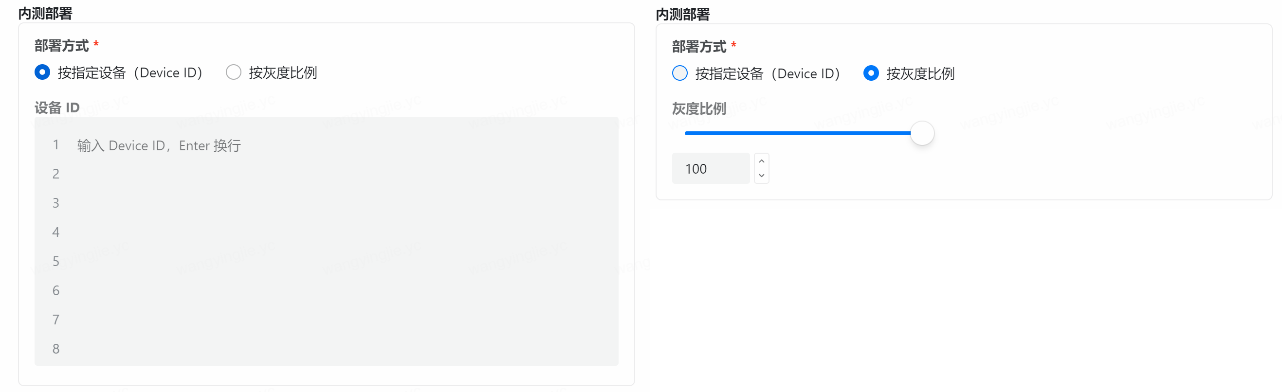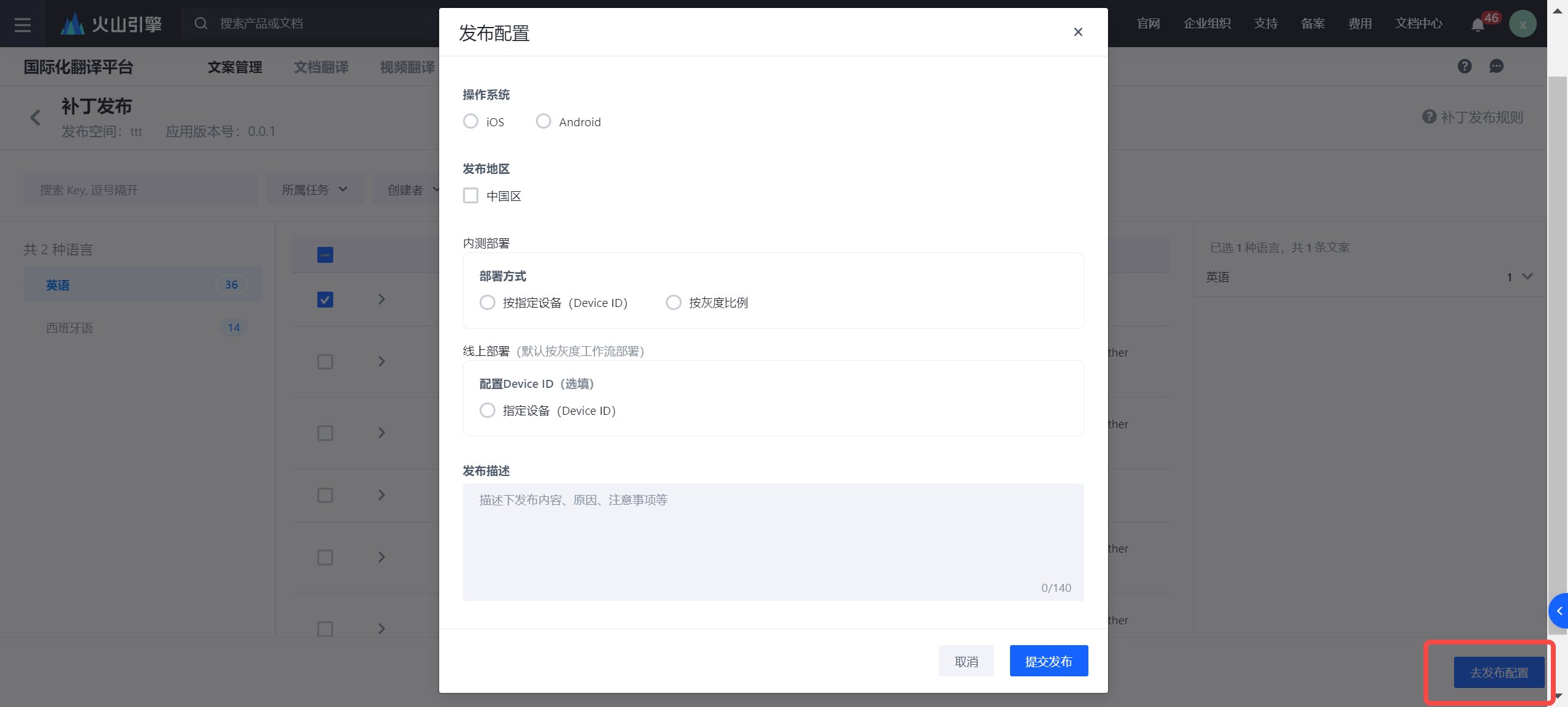 选择文案后,点击【去发布配置】,选择本次发布的操作系统与发布地区。接下来,分别配置内测部署与线上部署的部署方式。内测部署支持配置 “按指定设备” 和 “按灰度比例” 两种部署方式;线上部署默认进行 “按灰度工作流” 部署,同时支持配置 “按指定设备” 部署,指定设备(Device ID) 需输入数字。