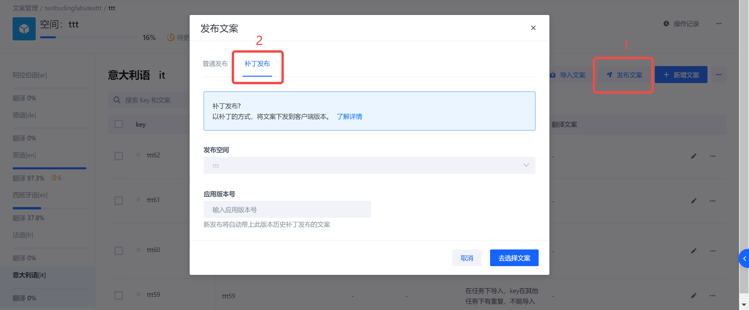 在项目下的空间详情页或翻译任务详情页,点击右上角的【发布文案】按钮,选择【补丁发布】Tab,即可开始客户端文案补丁发布。选择【发布空间】,填写【应用版本号】。