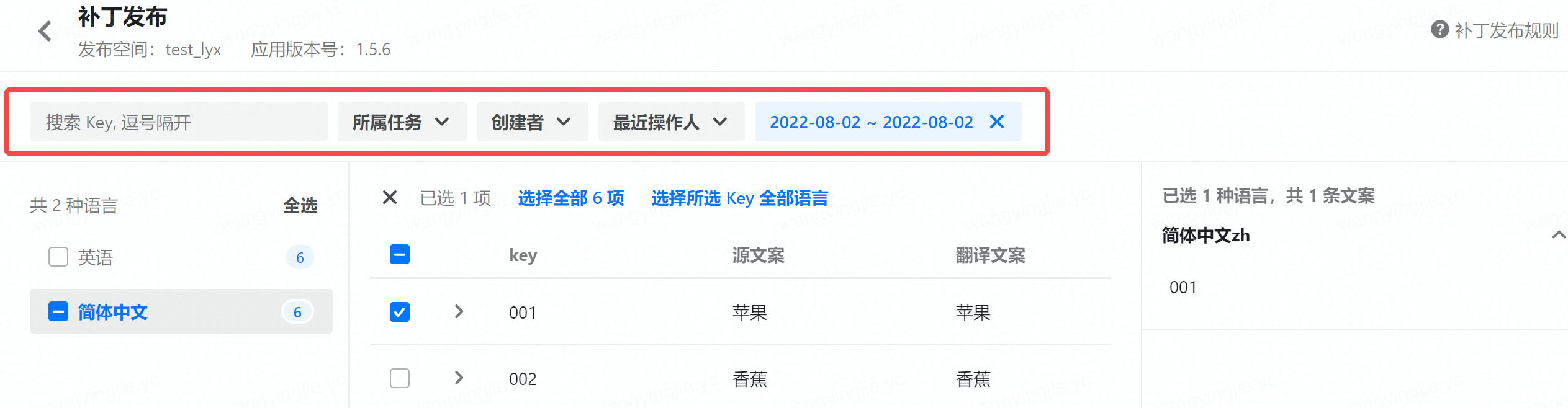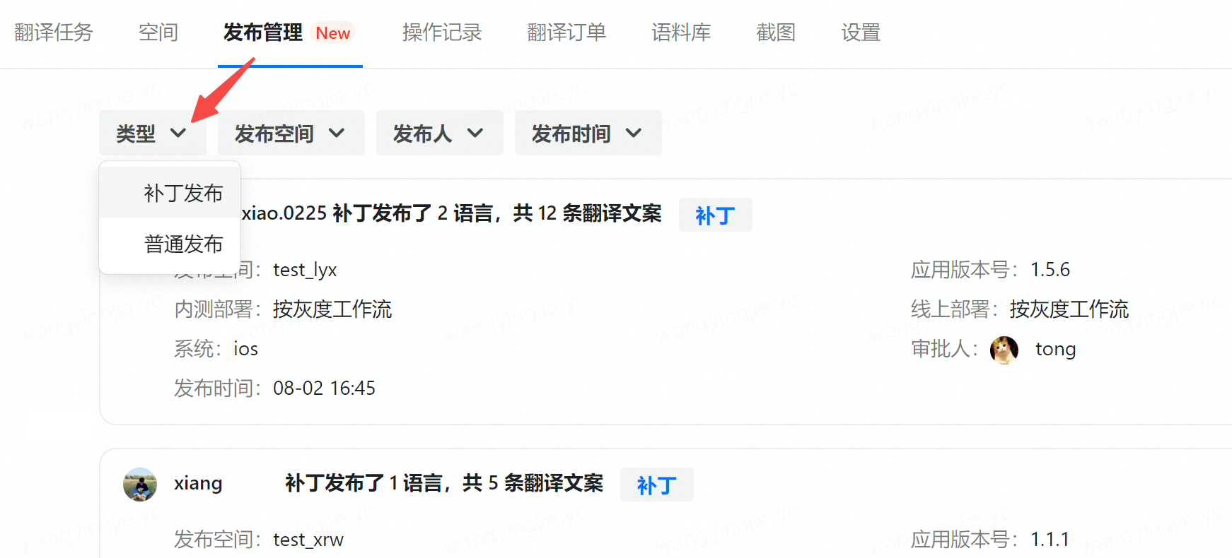 发布结束后,在项目下的【发布管理】菜单,可以筛选并查看“类型”为“补丁发布”的历史发布信息。