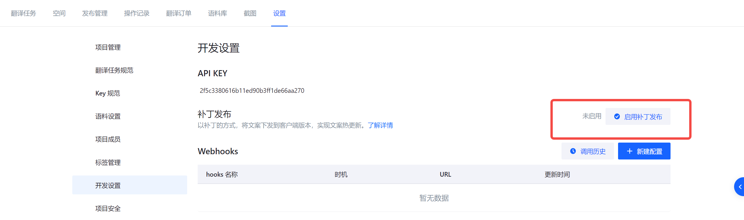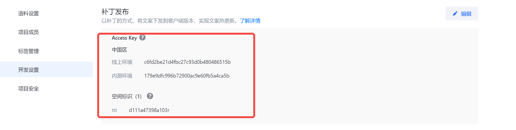 在发布客户端补丁之前,需要先启用补丁发布功能并进行相关配置。登录 「国际翻译平台」 管理端,进入对应项目。选择(项目)【设置】菜单 - 开发设置 - 启用补丁发布,可以选择需要开启补丁发布的空间。系统将自动生成 Access Key 与空间标识。