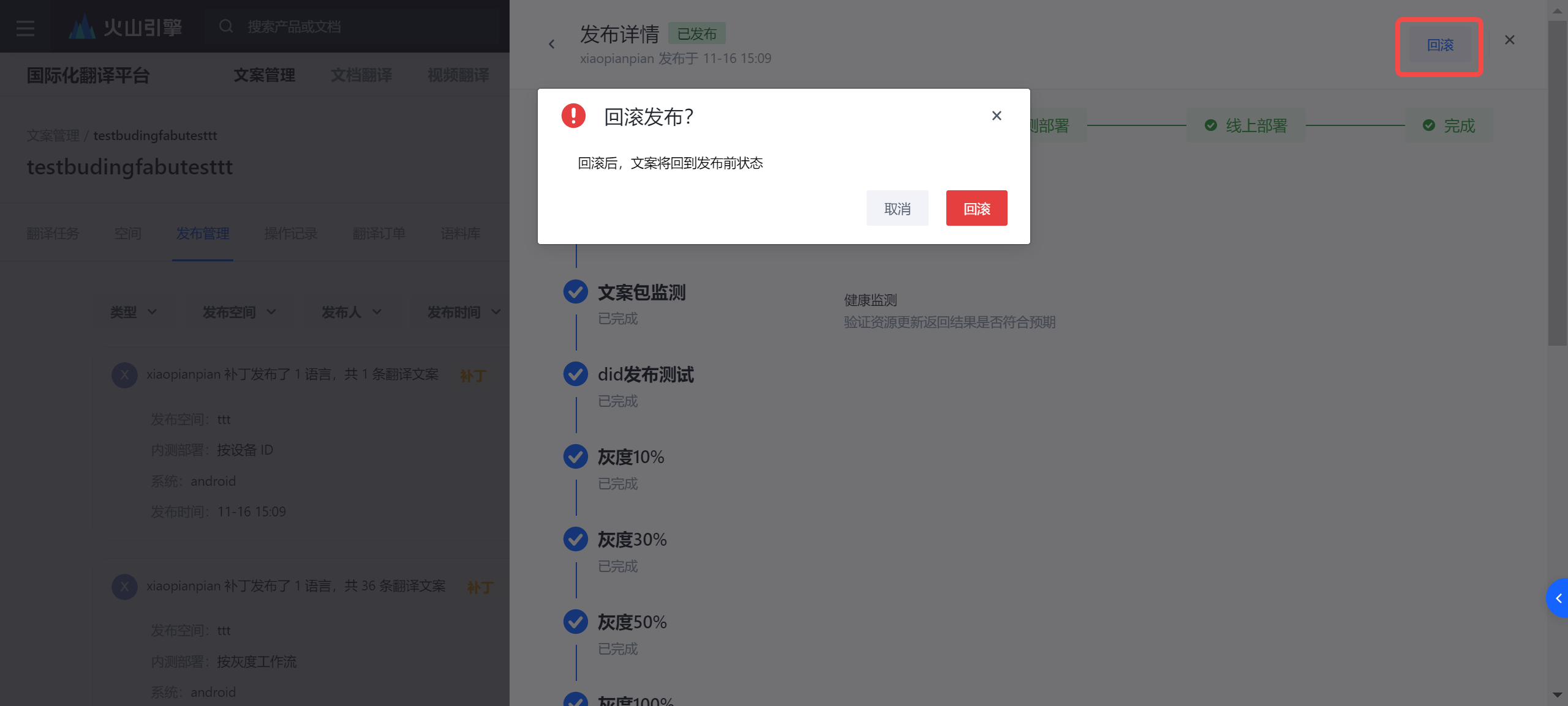 在发布文案过程中如果遇到异常情况,发布人有权限操作回滚,点击发布详情页右上角的【回滚】按钮,即可开始回滚。