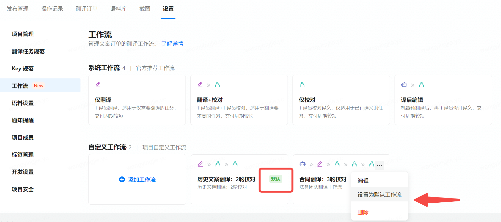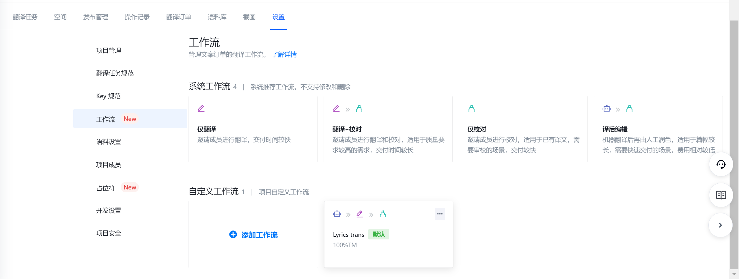 系统内置了4种常见的翻译工作流,系统工作流允许被设置为【默认工作流】,但不支持编辑和删除。