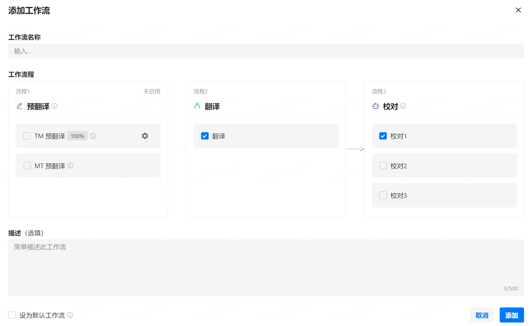 第4步: 选择是否将该工作流设置为默认工作流,勾选后,创建翻译订单时将默认选择该工作流。
