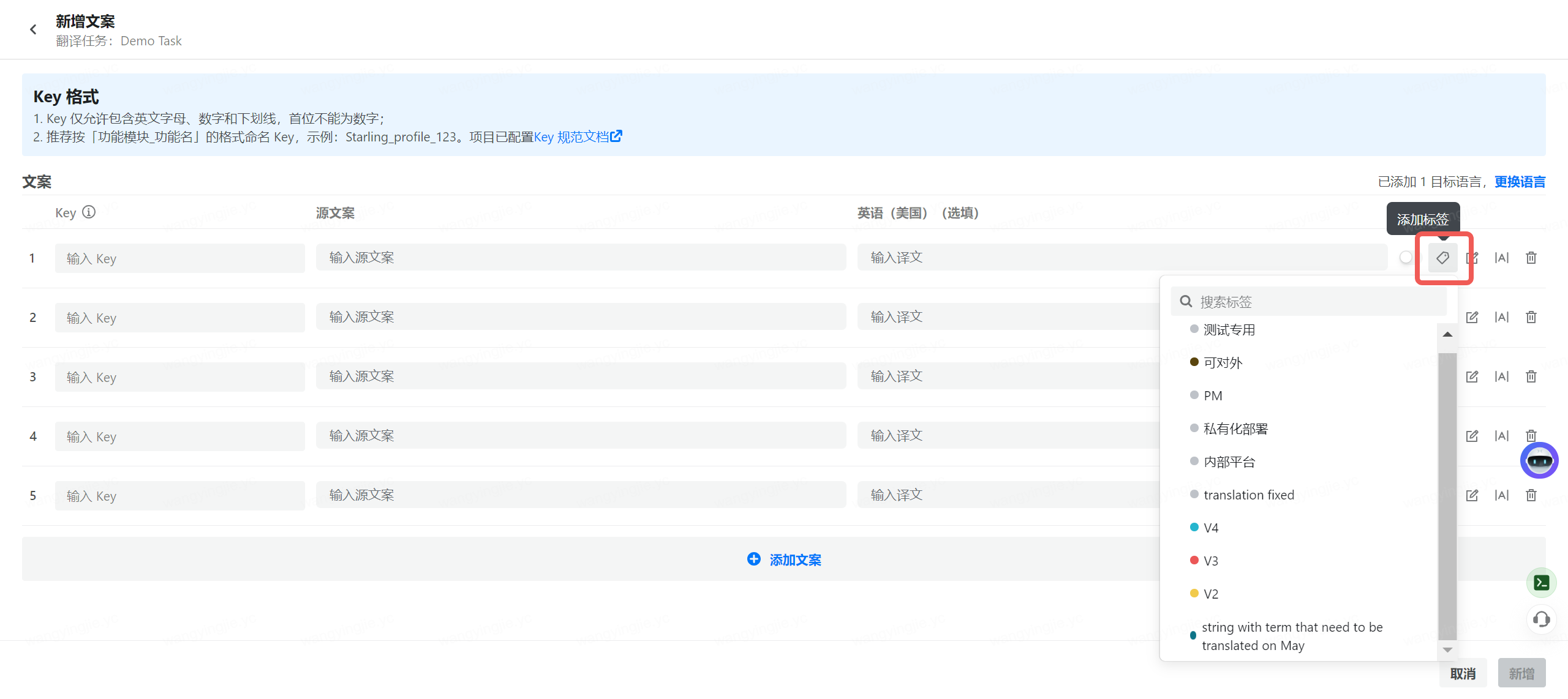 在文案项目>资源>标签,可找到标签管理模块。通过对源文案添加标签,可以帮助团队成员更好地精细化管理和筛选文案。用户可以根据上下文或按照特定主题对标签的组织和管理。