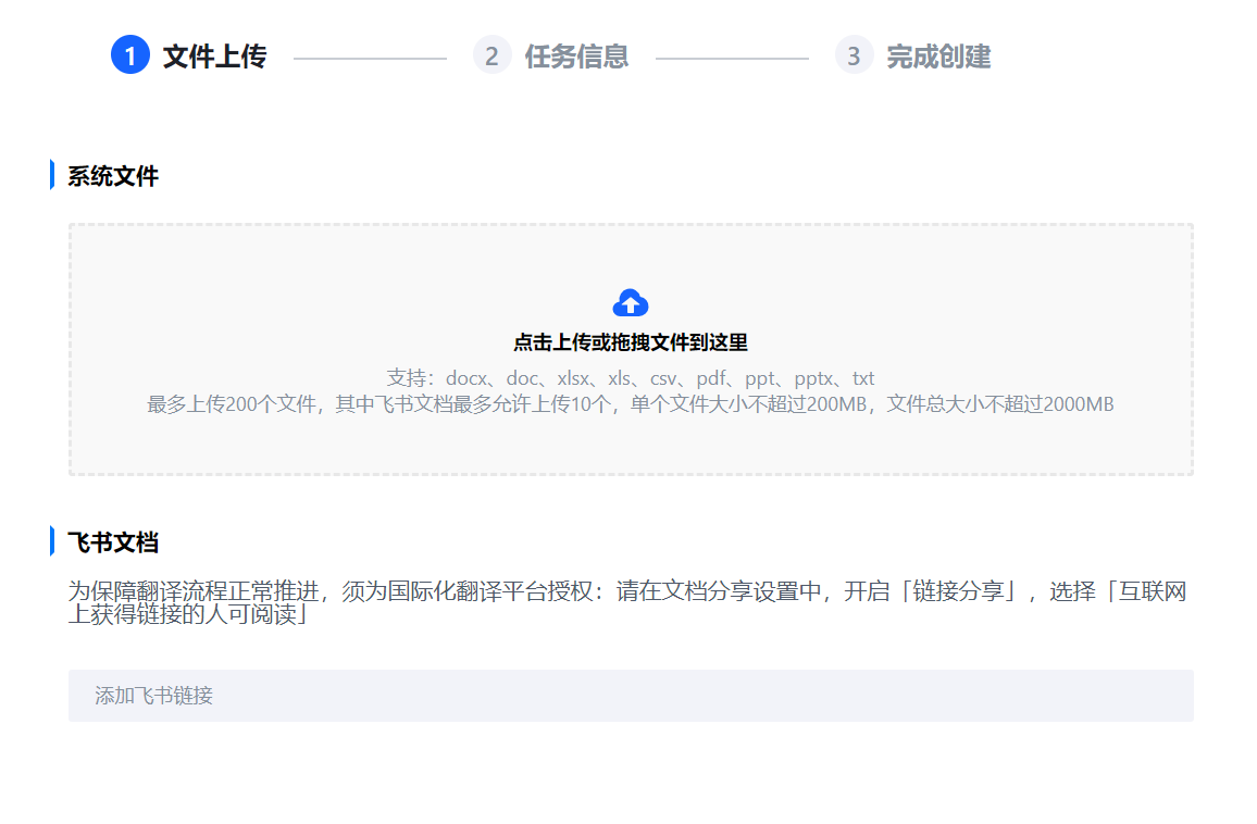 同一个翻译任务下的文档,源语言须为同一语言;不同源语言的文档须分开创建翻译任务。不同的文件类型线上文档解析支持程序不一样且每次最大支持200个本地文档,10个飞书文档。
