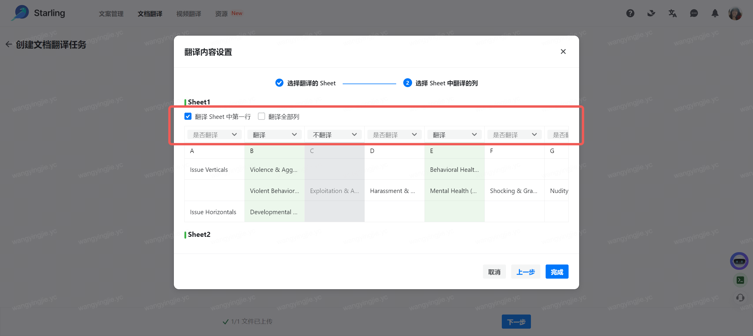 第2步: 选择每个Sheet中需要翻译的列,标记“翻译”的列将进入文档编辑器,其他列可打开原文档作为翻译参考进行预览。