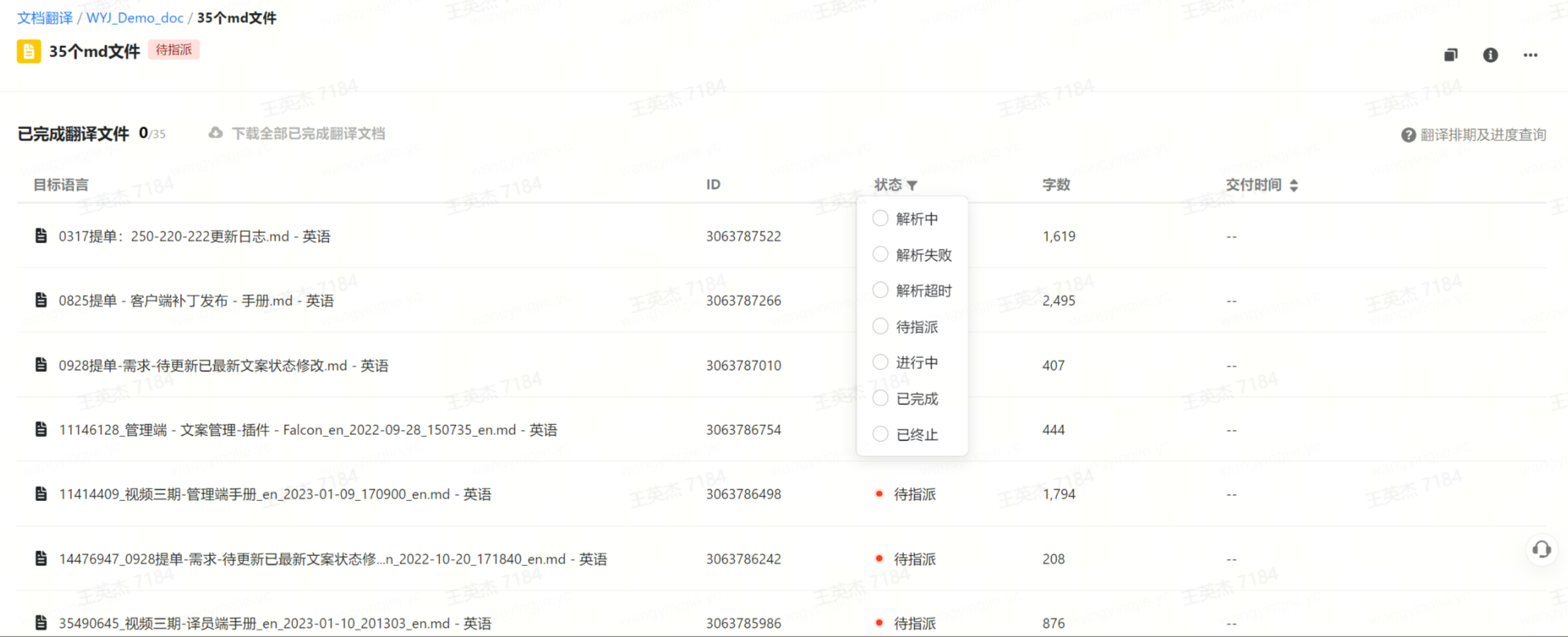 待指派:该任务尚未指派翻译员/校对员,可以随时终止。终止后,译员将停止翻译/校对