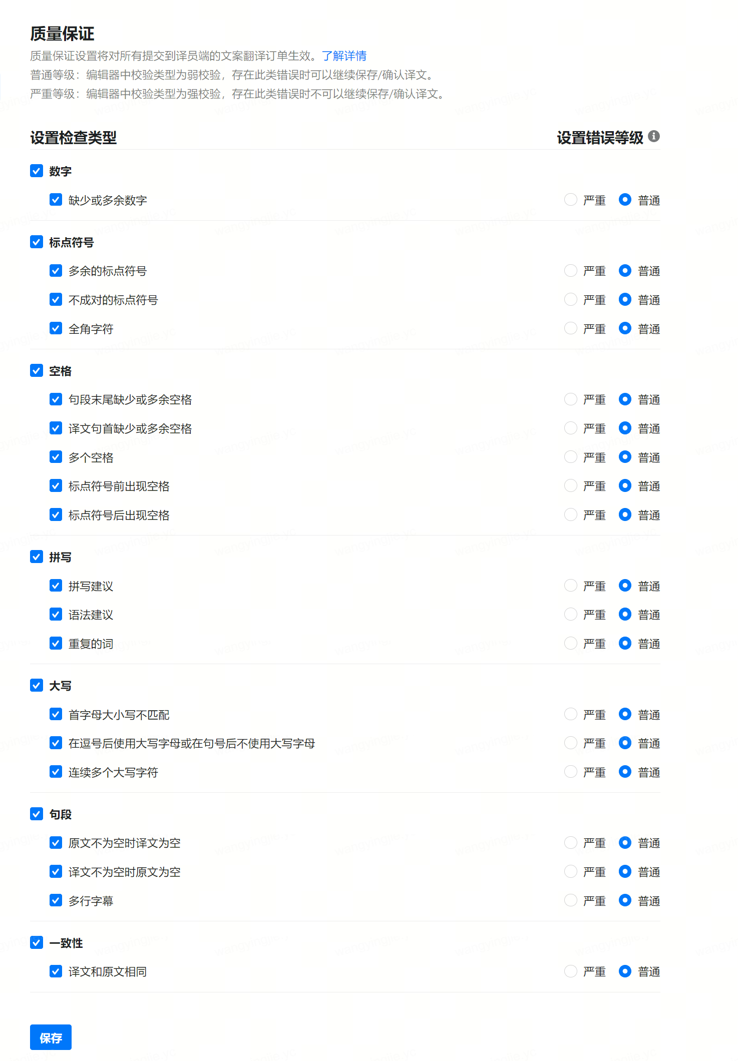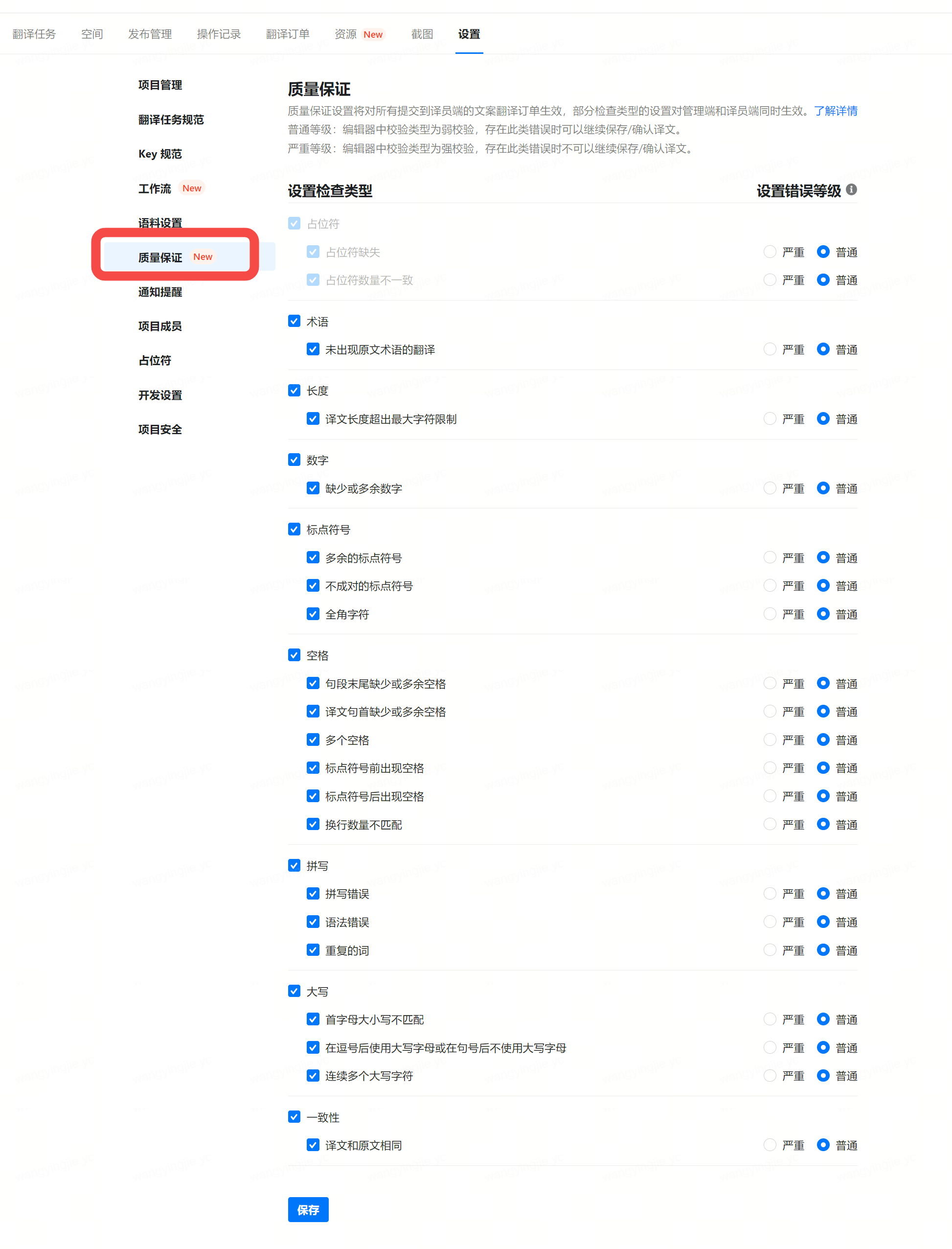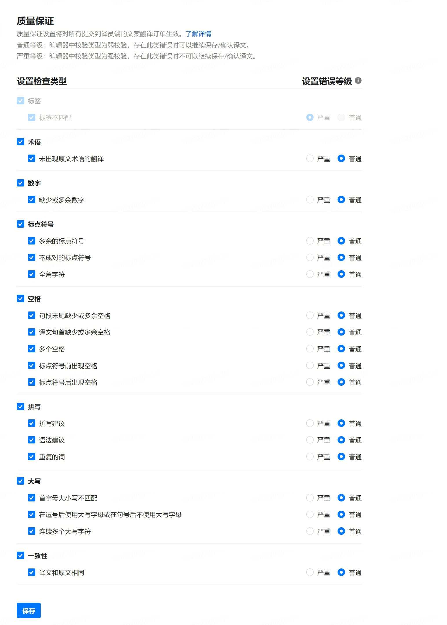 质量保证设置将对所有提交到译员端的翻译订单生效,部分检查类型的设置对管理端和译员端同时生效。