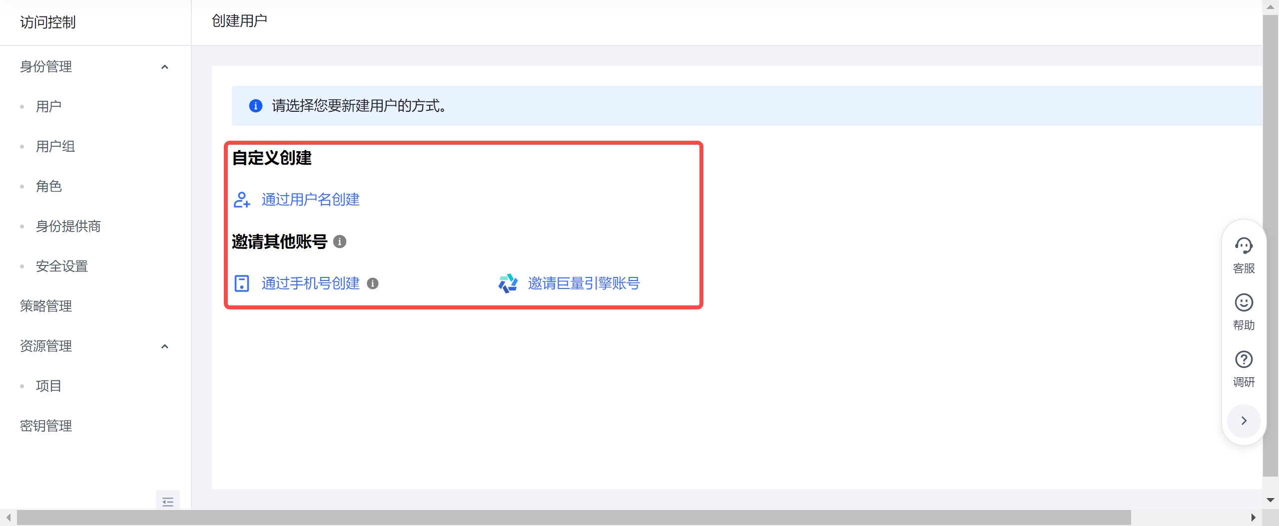 - 若选择【通过手机号创建】,输入子账号(即项目成员账号)的手机号。检查上述信息无误后,点击提交。手机号机主将会收到邀请成为子用户的链接,机主需点击链接设置用户名才可完成创建,链接24小时后失效。