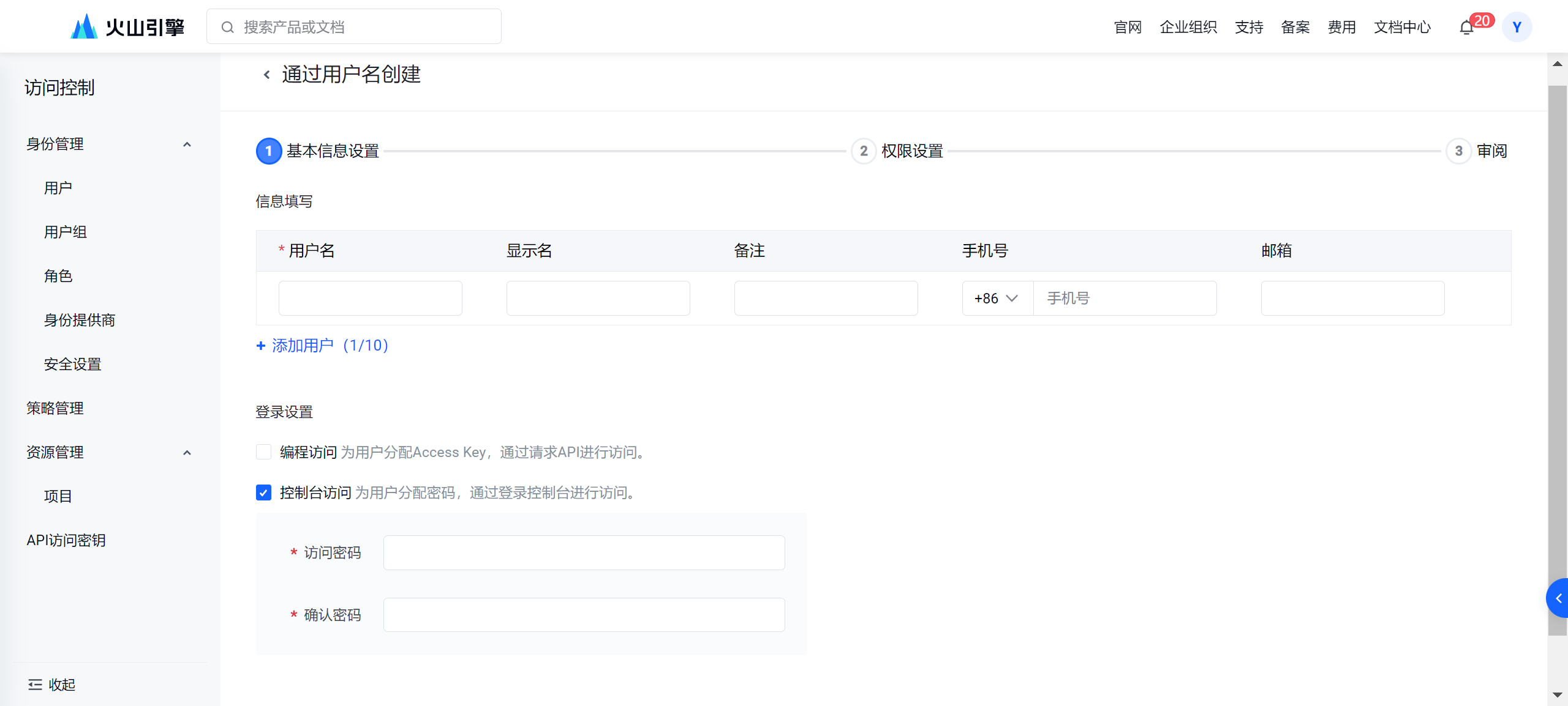 - 若选择【通过用户名创建】,设置子账号(即项目成员账号)的用户名(*必填)、显示名、备注、手机号、邮箱,可添加多个用户,同时需要为用户选择登陆设置(可多选):