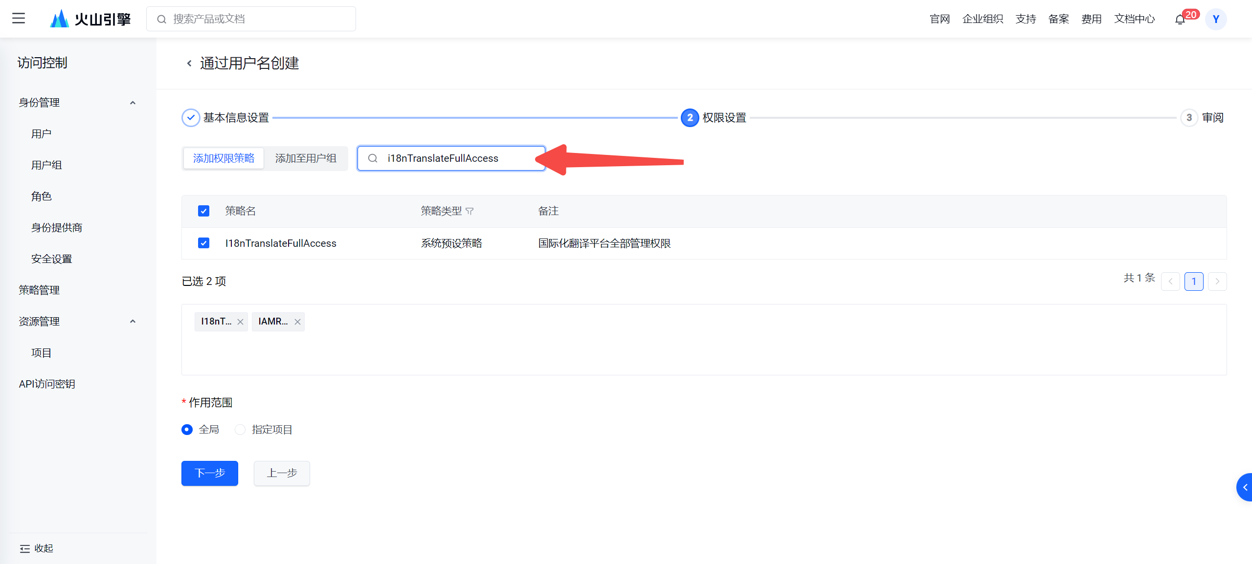 - 点击【下一步】,为用户添加权限策略,在策略中搜索并选择“i18nTranslateFullAccess”和“IAMReadOnly”两个策略。