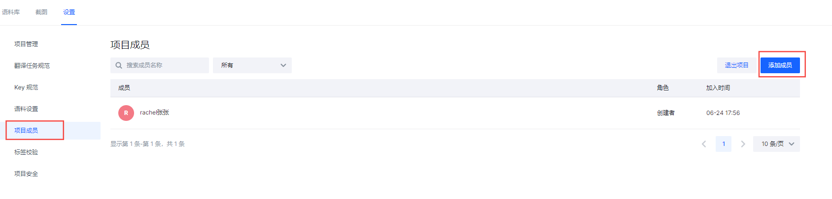 - 进入国际化翻译平台 > 文案管理 > 项目设置 > 项目成员,点击【添加成员】,填入用户名,并为该成员配置【项目角色】