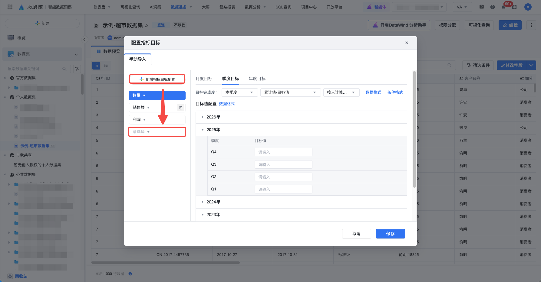 用户的操作账号需要具备数据集编辑权限才可配置指标目标。