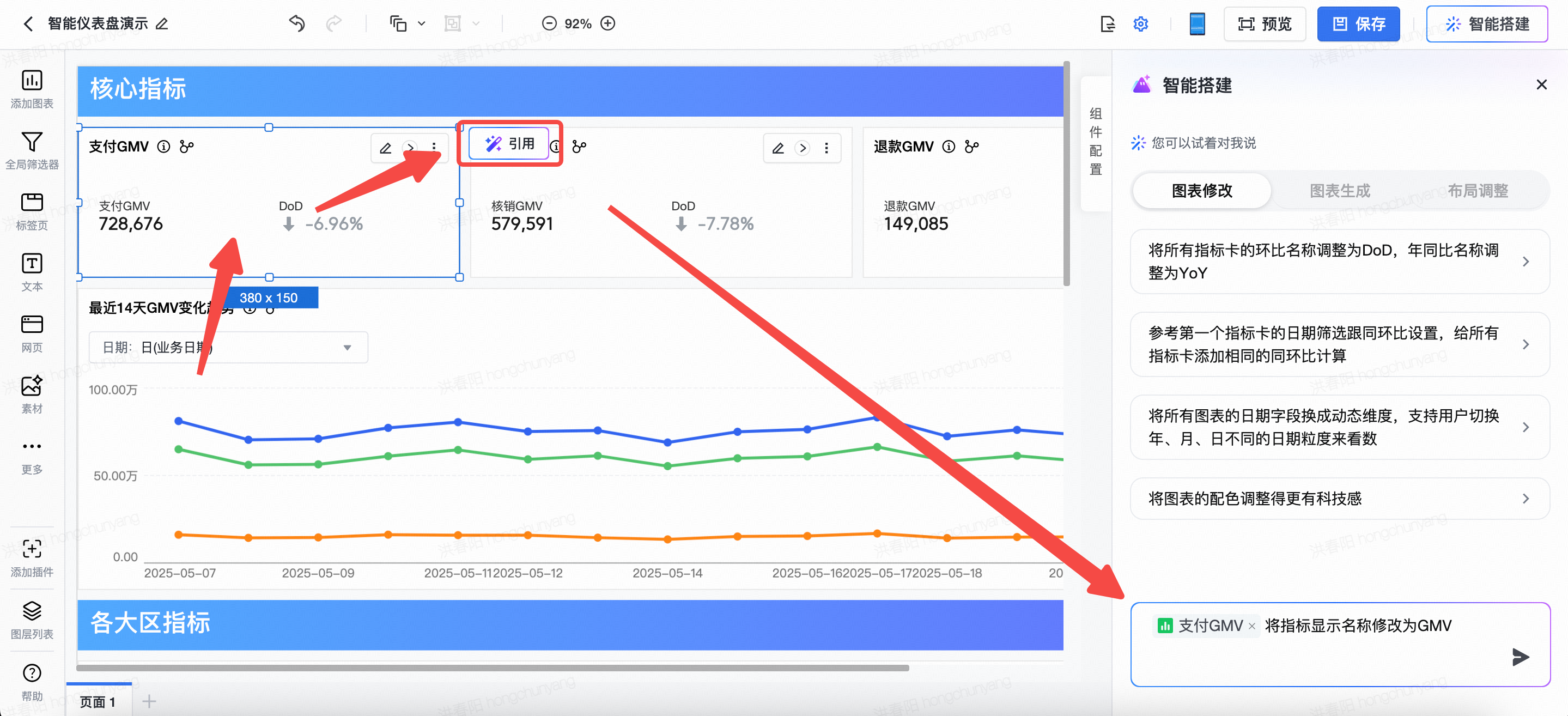 在使用智能搭建功能时,除了可以通过「@」对应的组件来选择操作对象外,还可以在仪表盘上选中某个想要操作的组件,选中后在组件的右上角会出现「引用」按钮,点击后会自动将该组件添加进智能搭建的操作对象中。