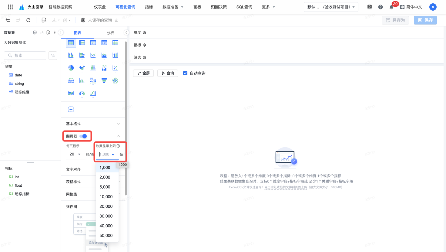 操作路径:「可视化查询」-「表格/透视表/明细表」-「图表配置」-「翻页器」-「数据显示上限」