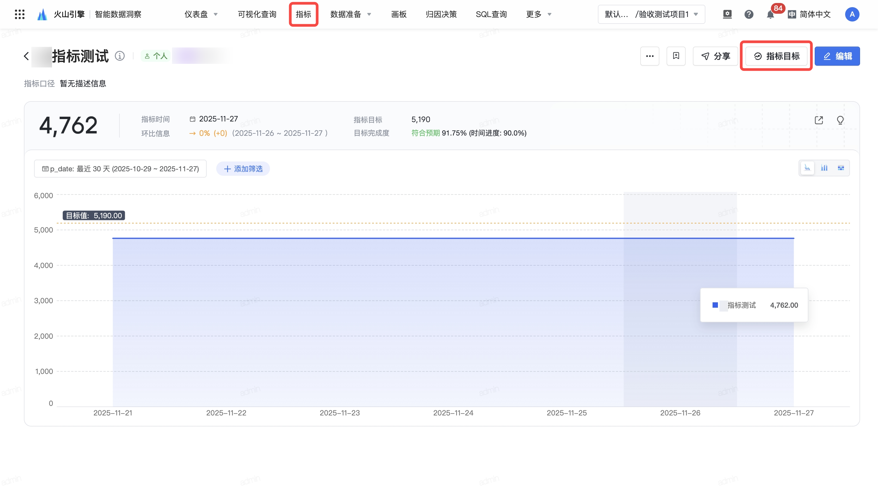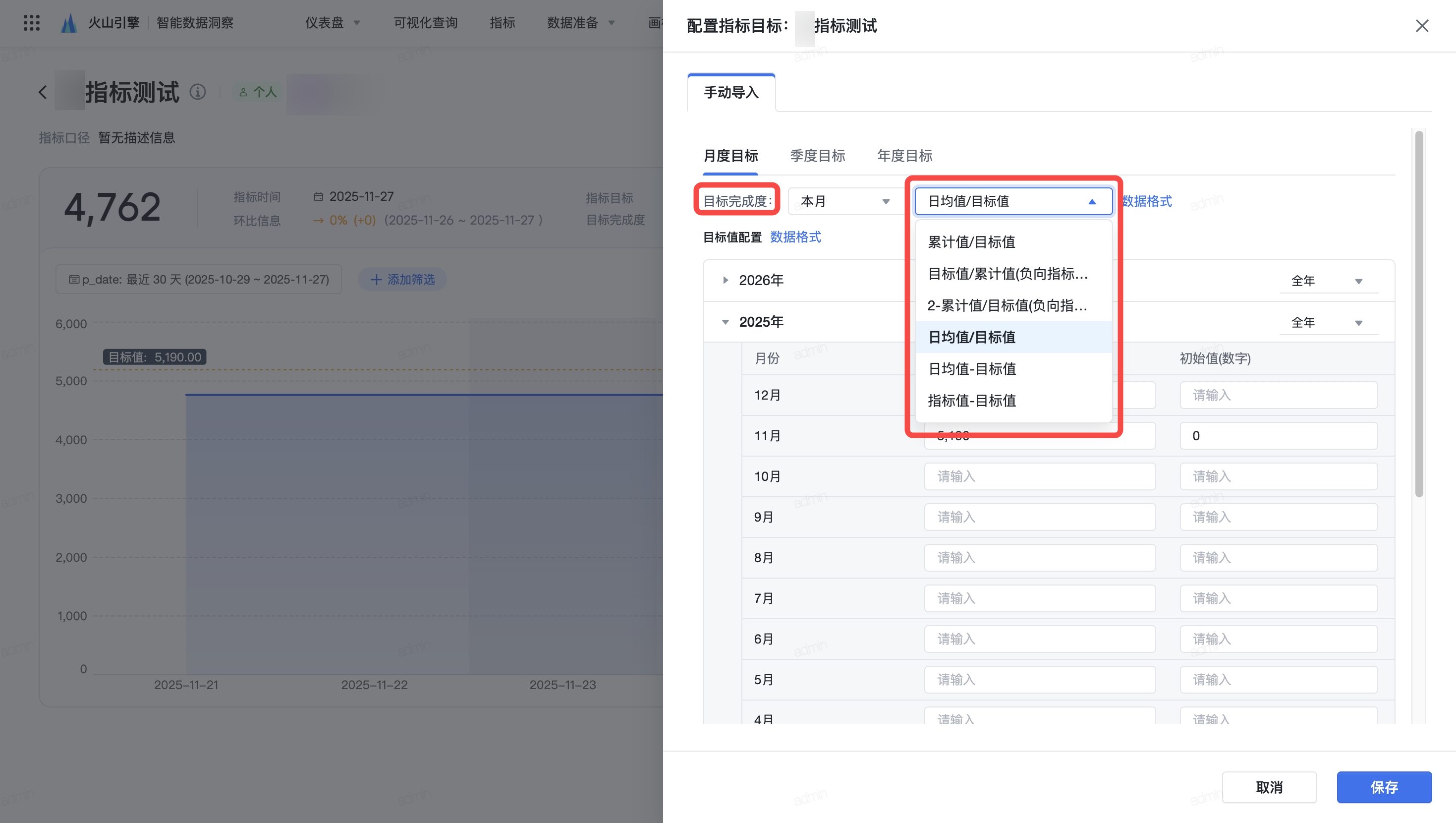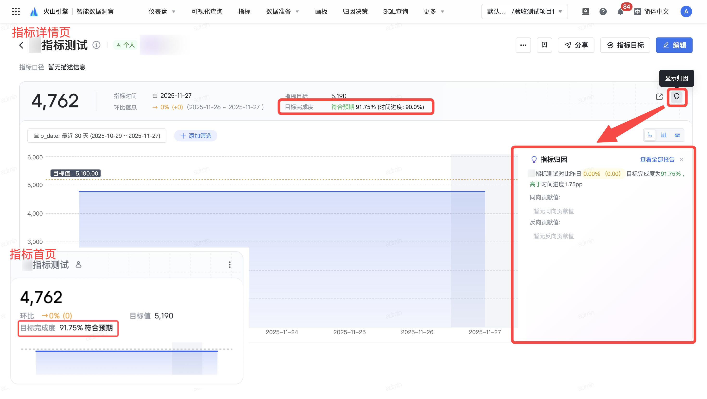 配置好完成度计算方式后,在指标首页和详情页会显示目标完成度,详情页还可查看归因报告。