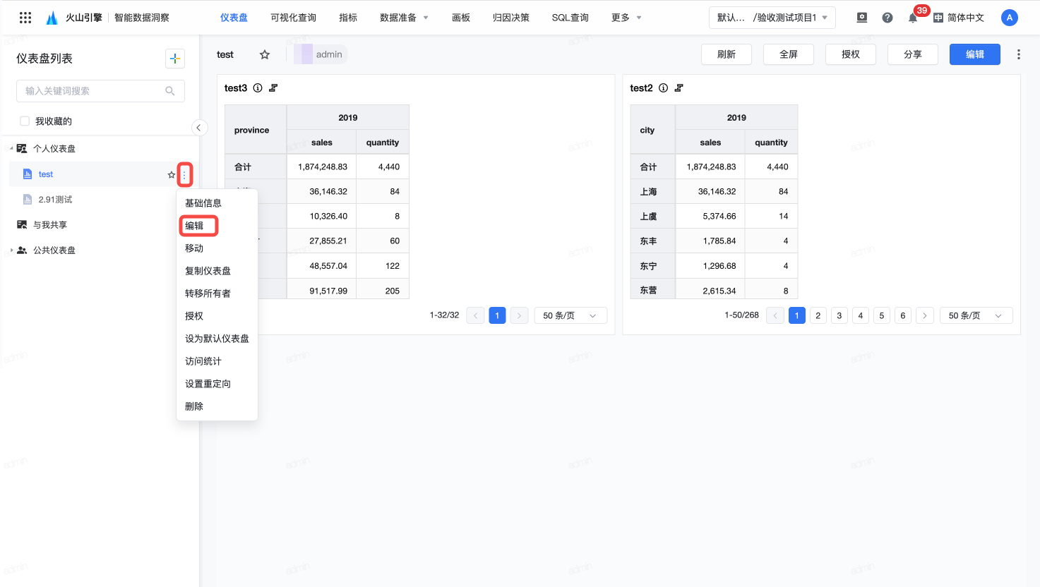 新版本中,左侧仪表盘列表的「更多」里加入「编辑」入口,跟阅览区右上角的编辑按钮功能一致。若当前有其他用户正在编辑,则「编辑」入口置灰,鼠标悬停会提示用户——xxx正在编辑仪表盘。