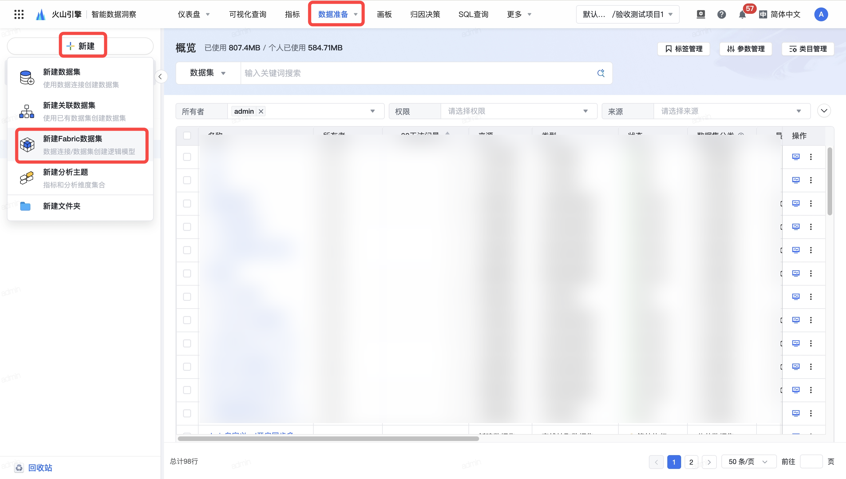 更多关于 Fabric 数据集的操作指导请参见Data Fabric 概述,行列权限设置请参见数据行列权限。