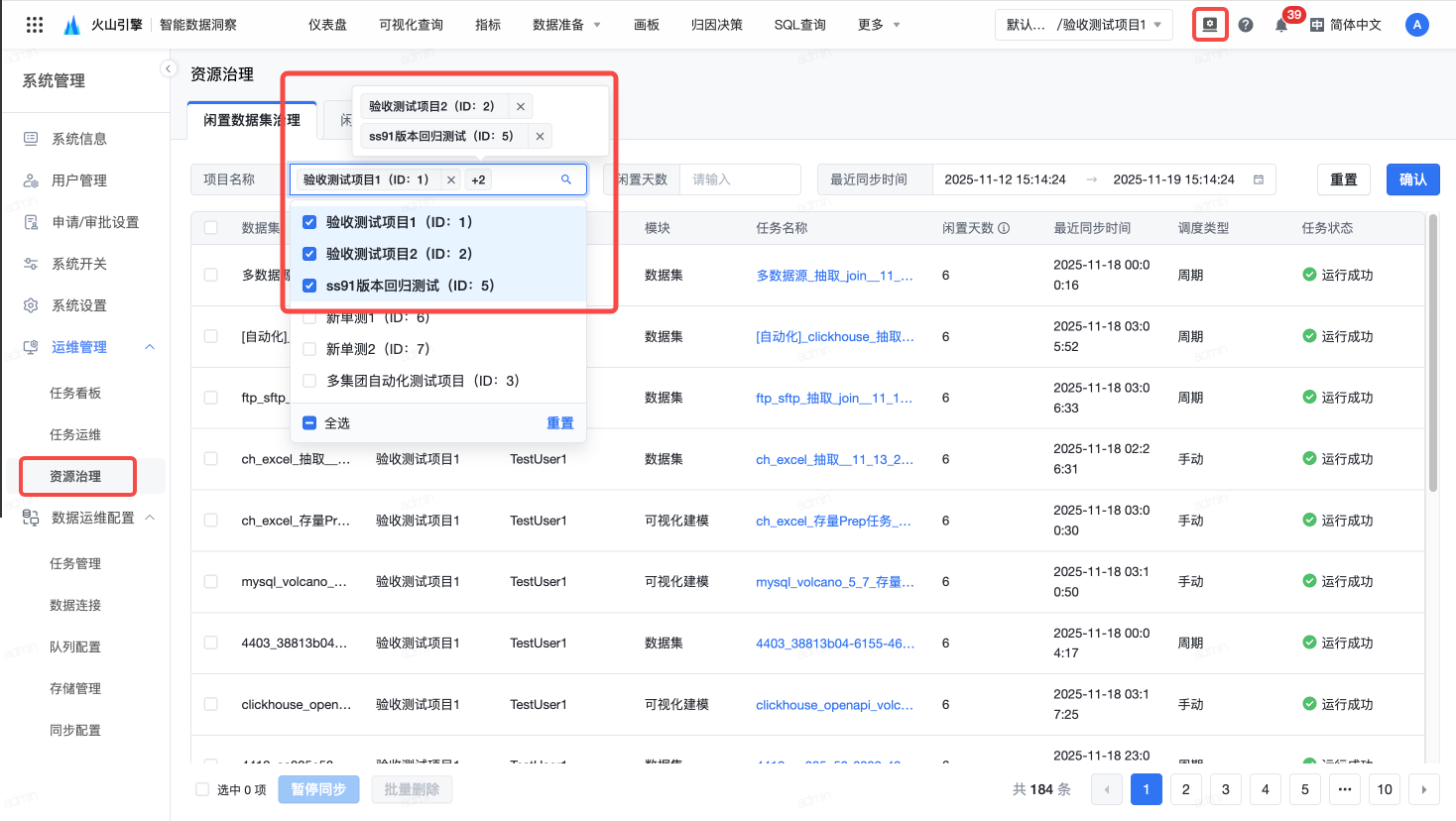 私有化环境中,系统管理的「资源治理」页面可以选择多个项目进行筛选,对于闲置数据集治理、闲置Excel/CSV治理均适用。此功能支持管理员查看全系统的闲置资源,不用切换项目,提升运维效率。