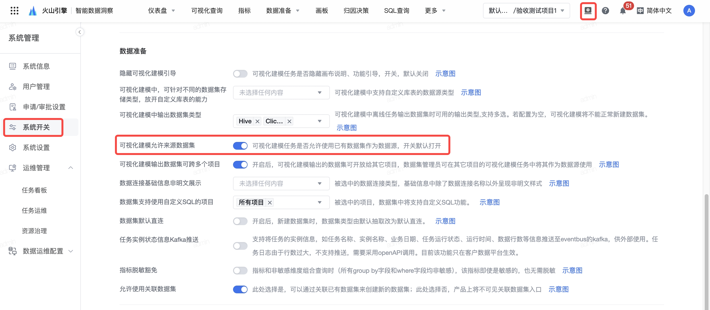 操作路径:「控制台」-「系统开关」-「可视化建模允许来源数据集」