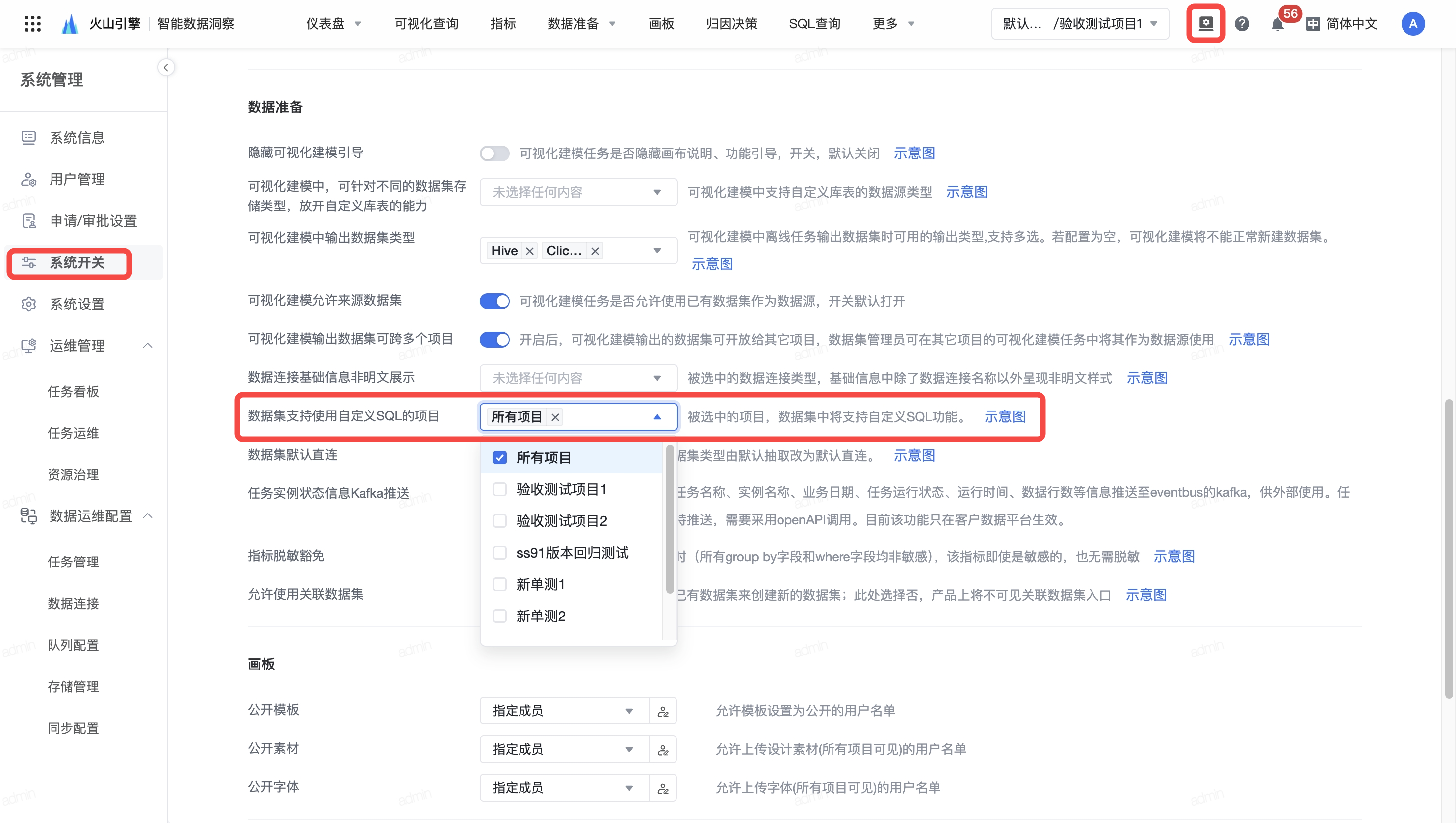 操作路径:「控制台」-「系统开关」-「数据集支持使用自定义SQL的项目」