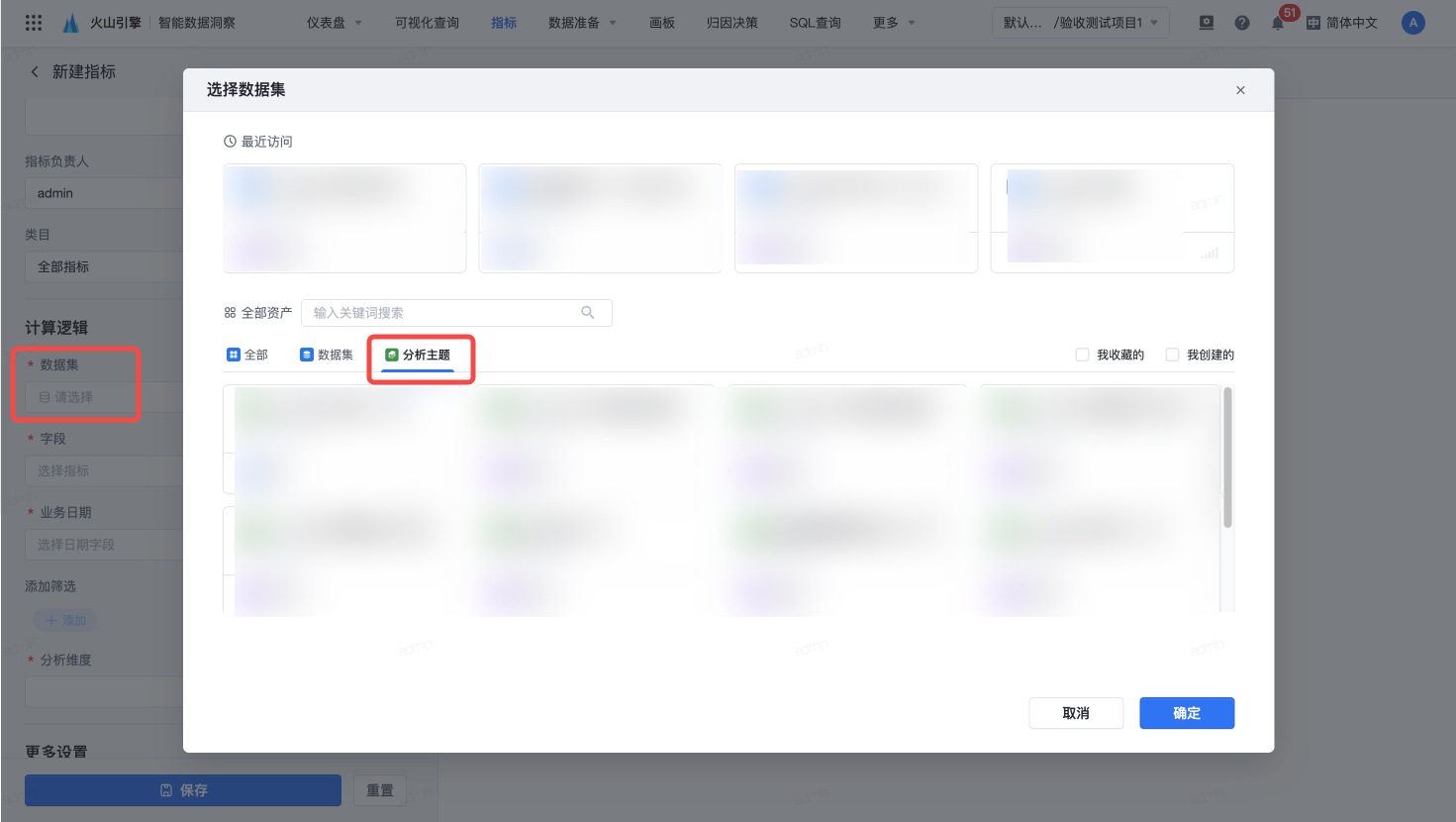 操作路径:「指标」-「新建指标」-「数据集」-「分析主题」