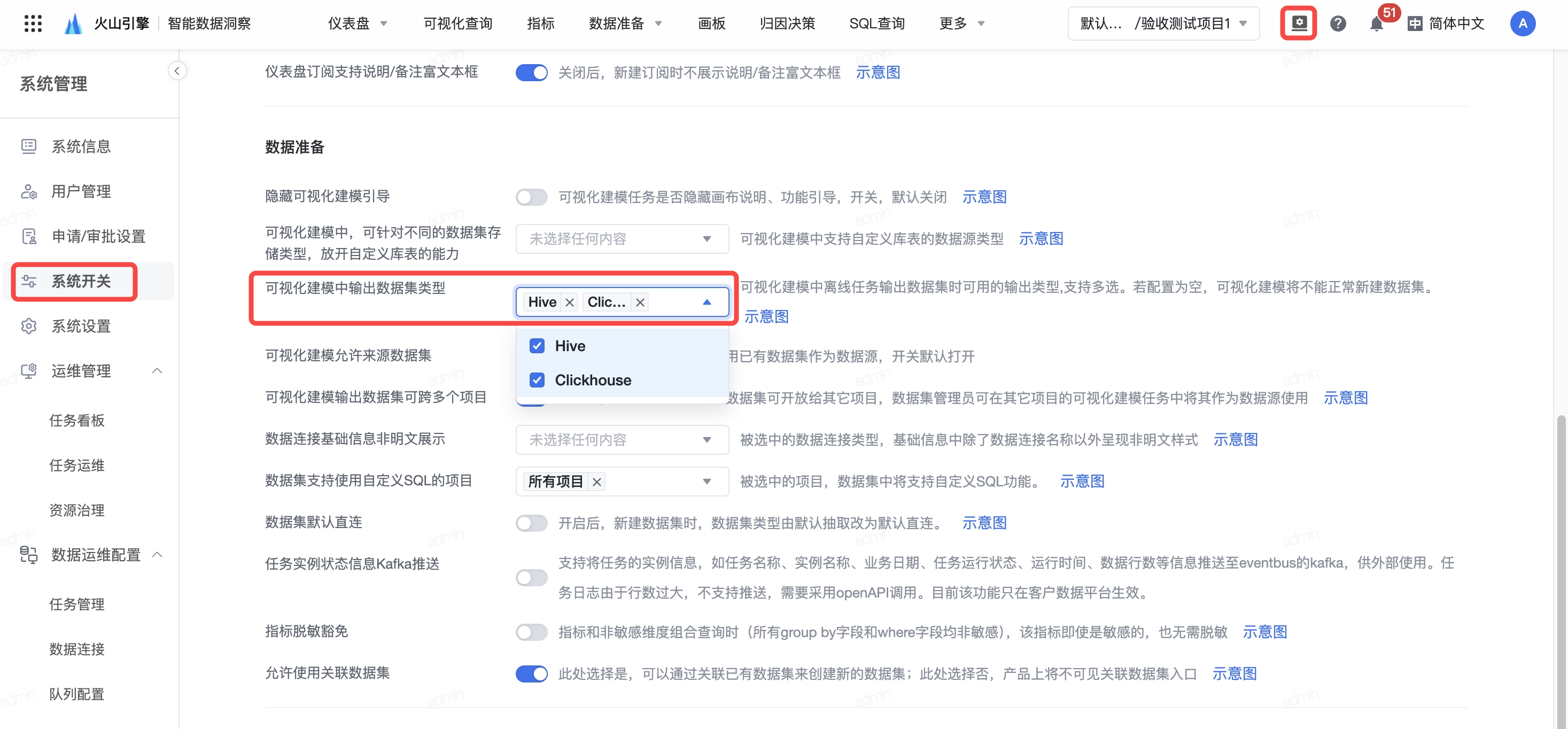 操作路径:「控制台」-「系统开关」-「可视化建模中输出数据集类型」