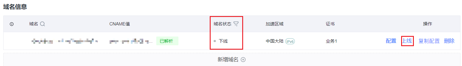 - 在完成域名上线配置后,系统最长在 10 分钟左右生效。上线期间,域名状态为配置中。