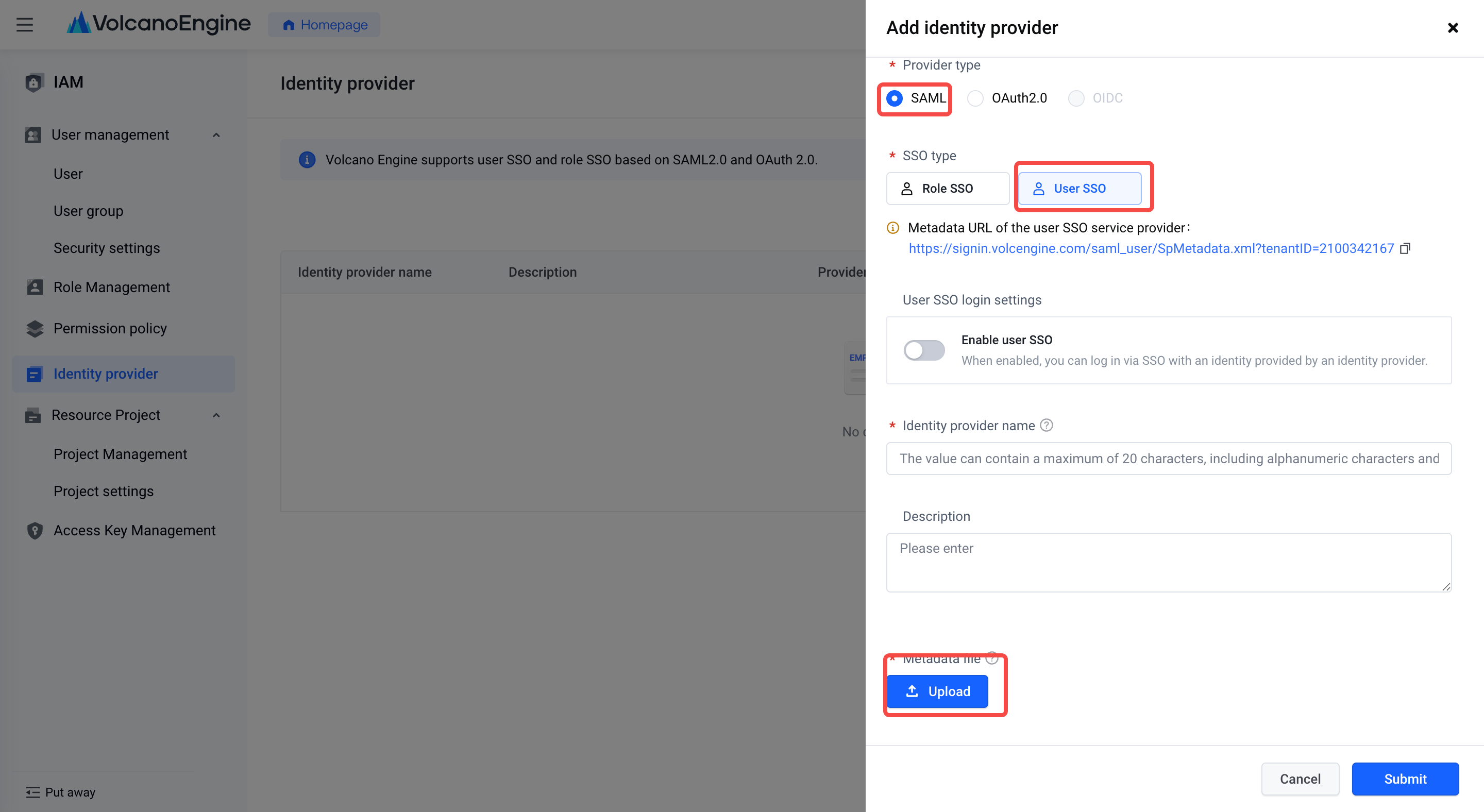 Client side ID: Automatically recognized by the service provider metadata file of the Volcano Engine user SSO, it is the entityID provided by Volcano Engine.