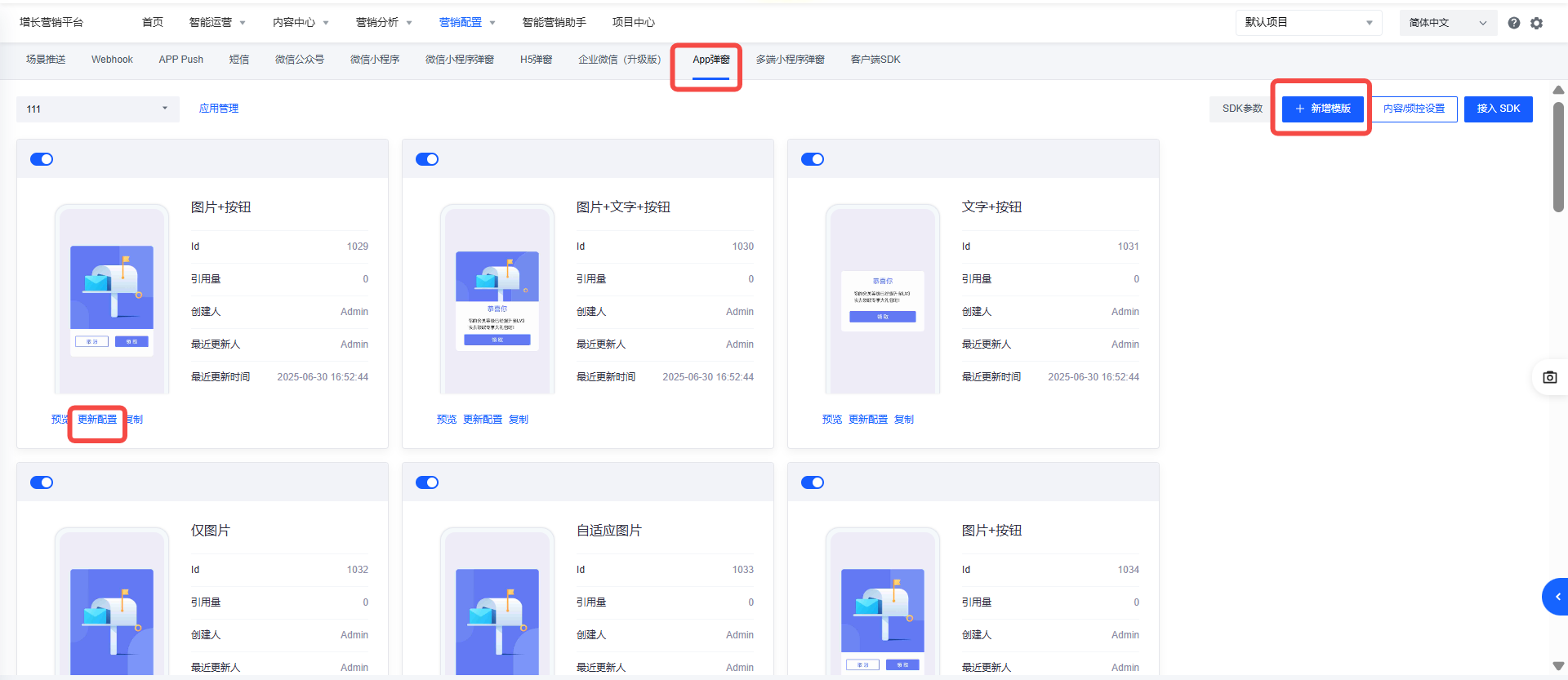 点击新增模板进入模板编辑页,或者基于系统已有的模板「更新配置」