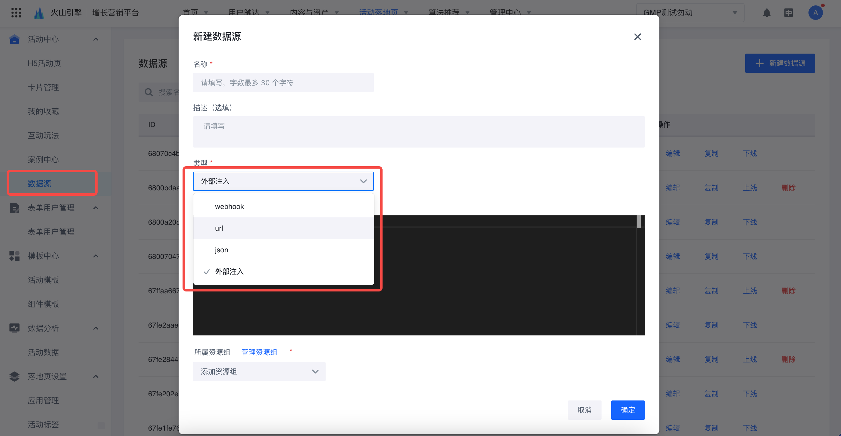 支持Webhook、URL、JSON、外部注入等类型的数据源,注入后的数据源用于卡片、H5等活动页面的展示。本文为您介绍如何创建数据源。