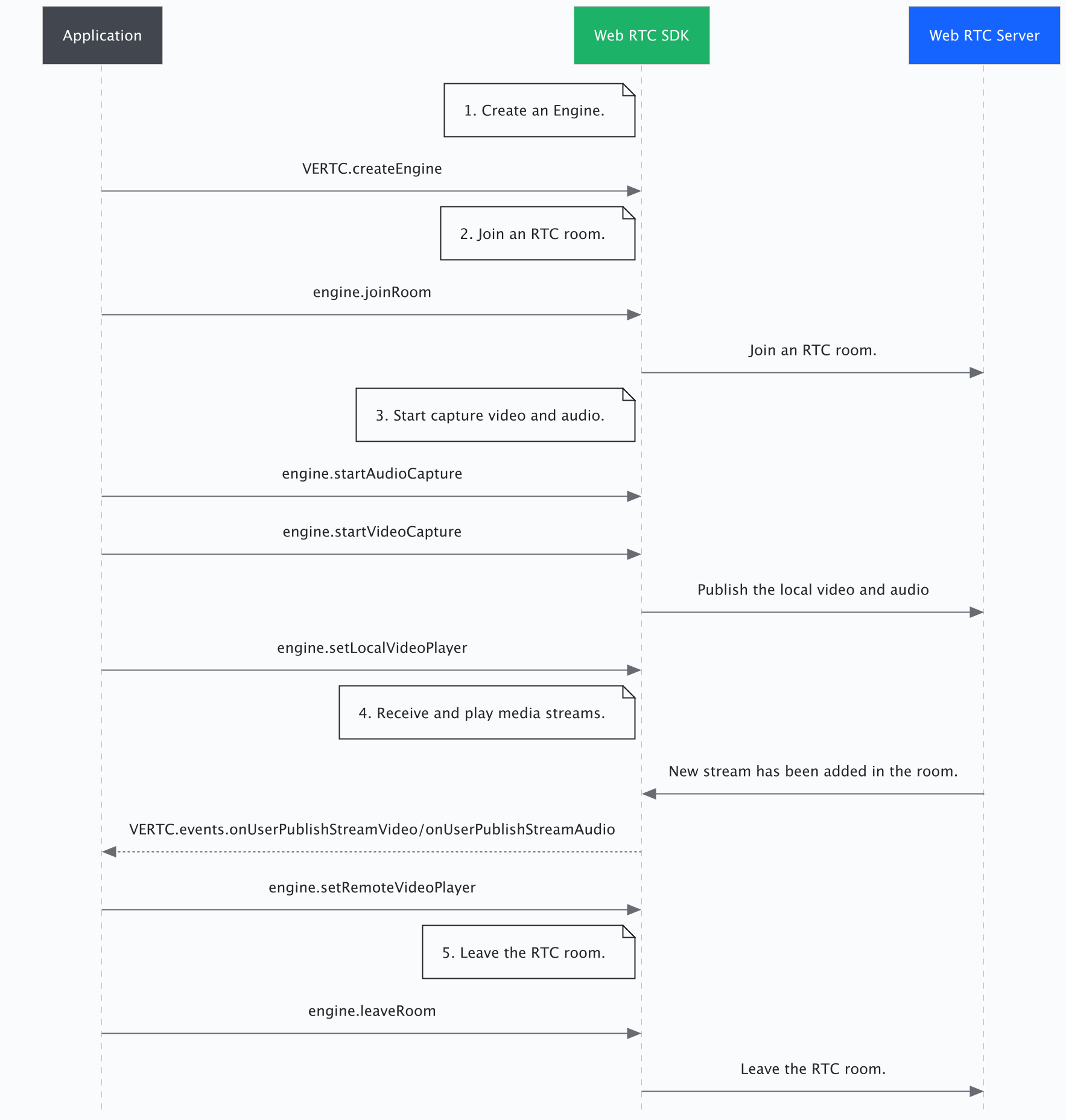 以下示例代码以使用 npm 方式集成 Web SDK 为例,并统一采用按需解构导入的风格。如果您使用方式二或方式三,请勿使用 import 语句,并确保所有 SDK 成员都通过全局的 VERTC 对象访问(例如 VERTC.createEngine())。