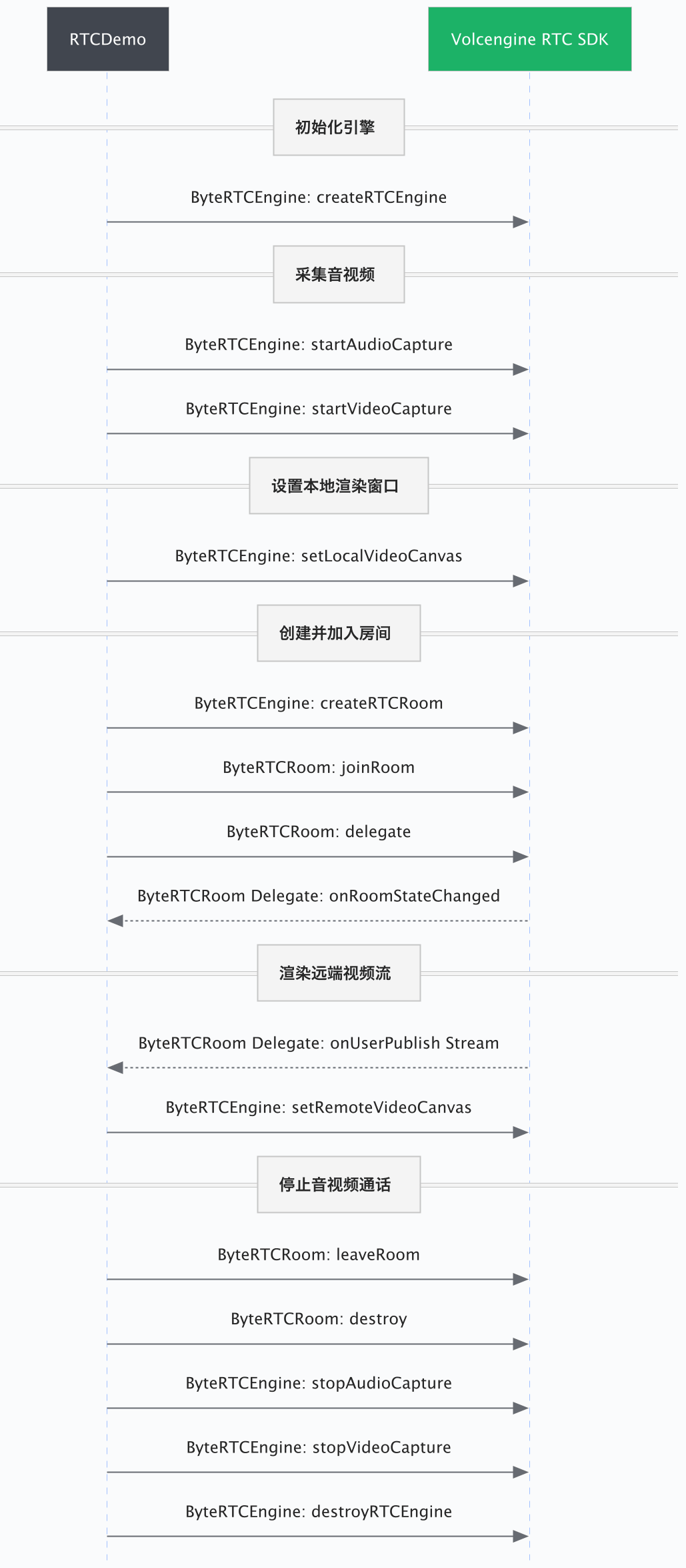 下图为使用火山引擎 RTC SDK 实现基础音视频通话的 API 调用时序图。