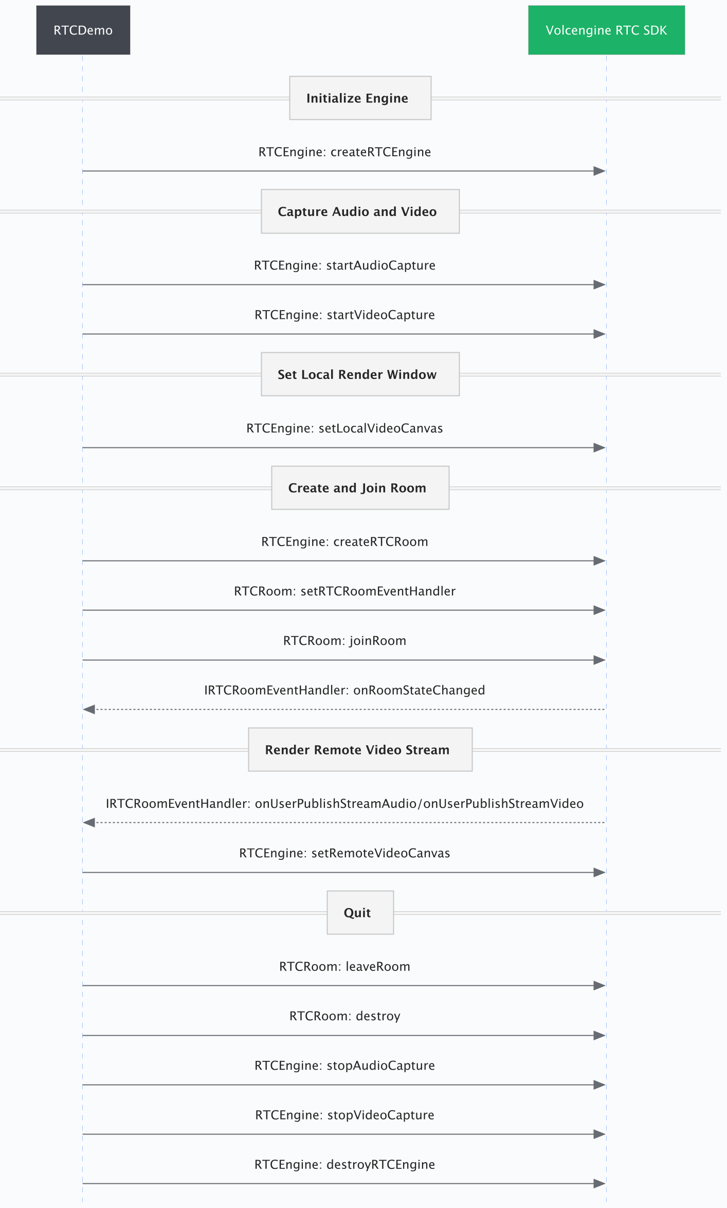 下图为使用火山引擎 RTC SDK 实现基础音视频通话的 API 调用时序图。
