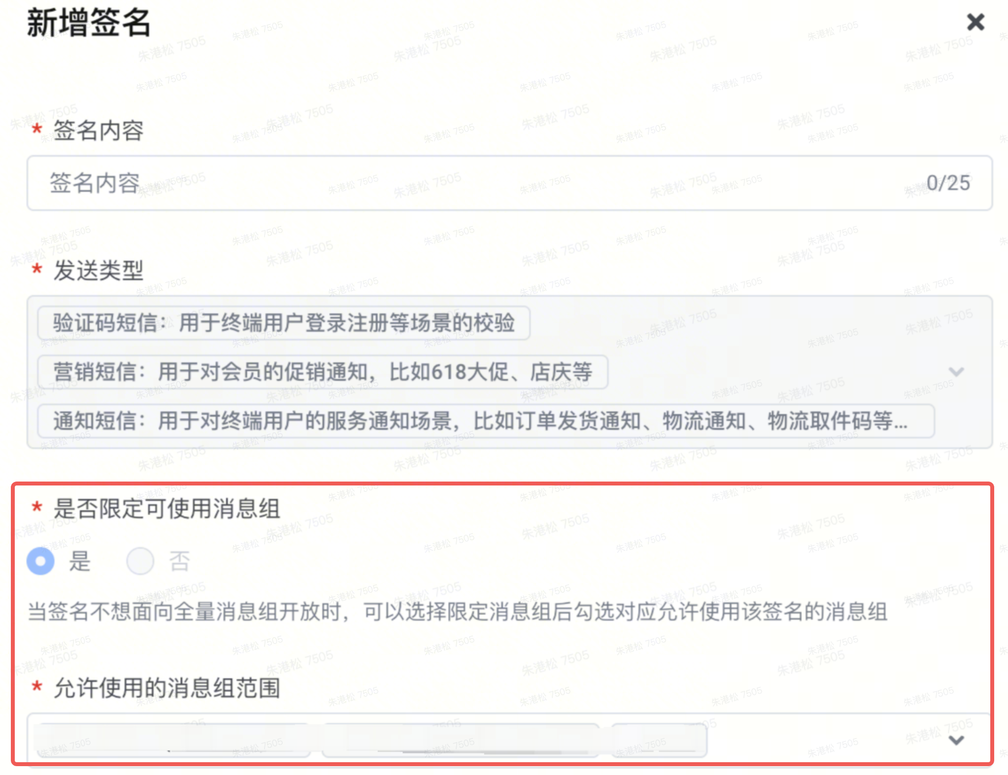 | 旧版本系统 | 申请签名时,需要指定消息组,不同消息组下新增签名时,需要重复申请。 |