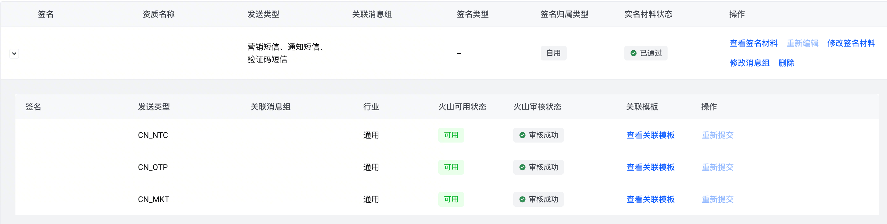变更点一:同一主账号下的不同消息组的重复签名,将会合并为一行,并按照Channeltype和行业拆分成二级记录。(控制台上直观表现为多行签名记录合并为一个)