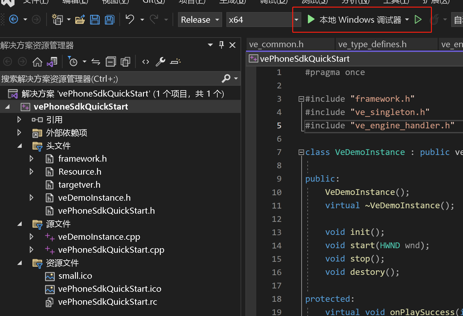 创建一个 Windows 桌面应用程序或使用下载的 SDK 包中的 vePhoneSdkQuickStart 工程。