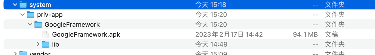 注意:需要确保目录和文件层级准确无误。内置到 system 分区的文件,最外层文件夹一定是 system;内置到 vendor 分区的文件,最外层文件夹一定是 vendor。参考以下示例: