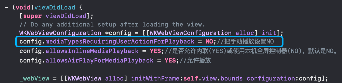 在自研 APP 客户端内的 Webview 打开的场景下,可以通过开启自动播放的权限,来解决无法自动播放的问题。比如在 iOS 的 Webview 代码中,需要把 “手动播放” 参数设置为 “NO”,参考以下示例: