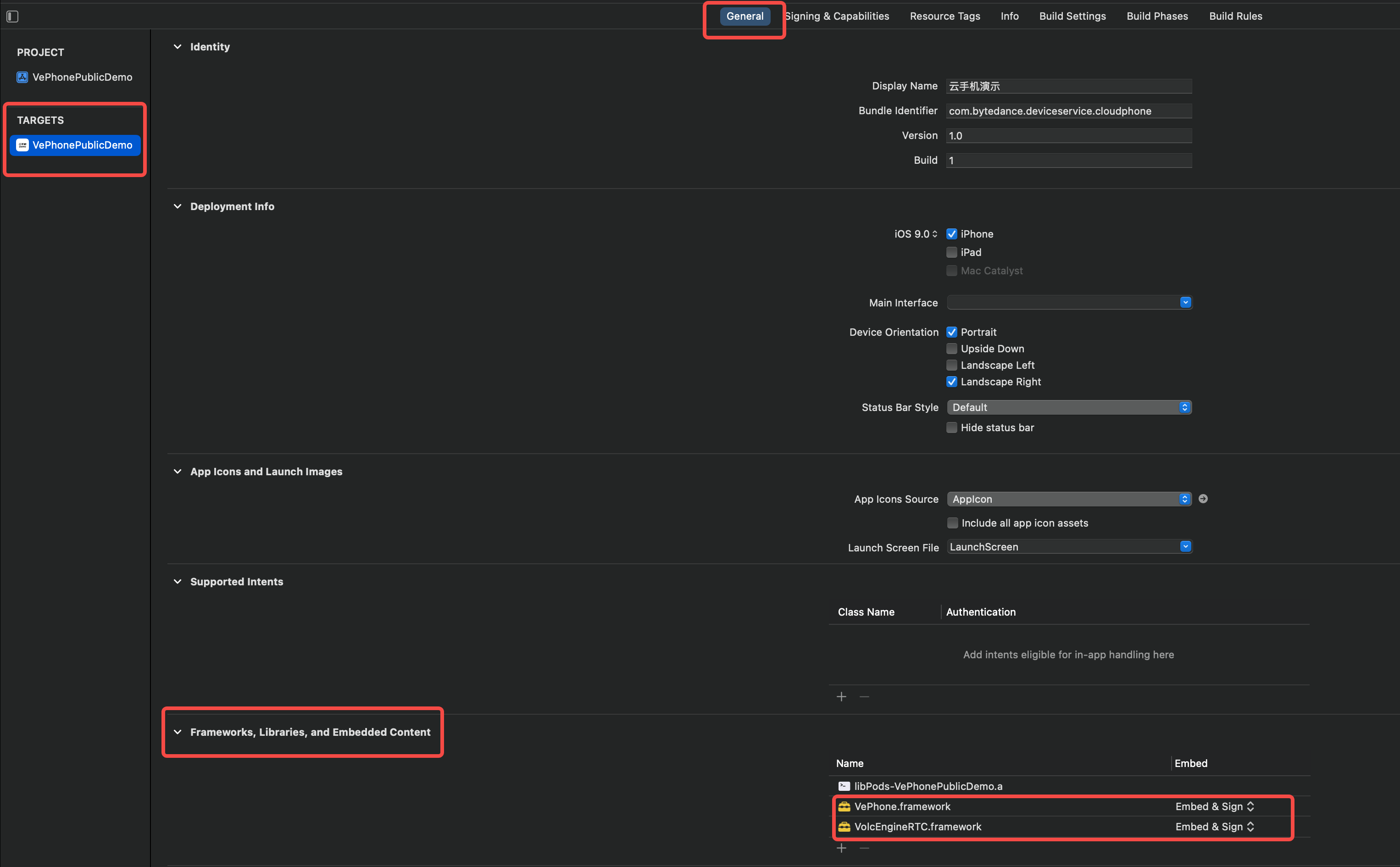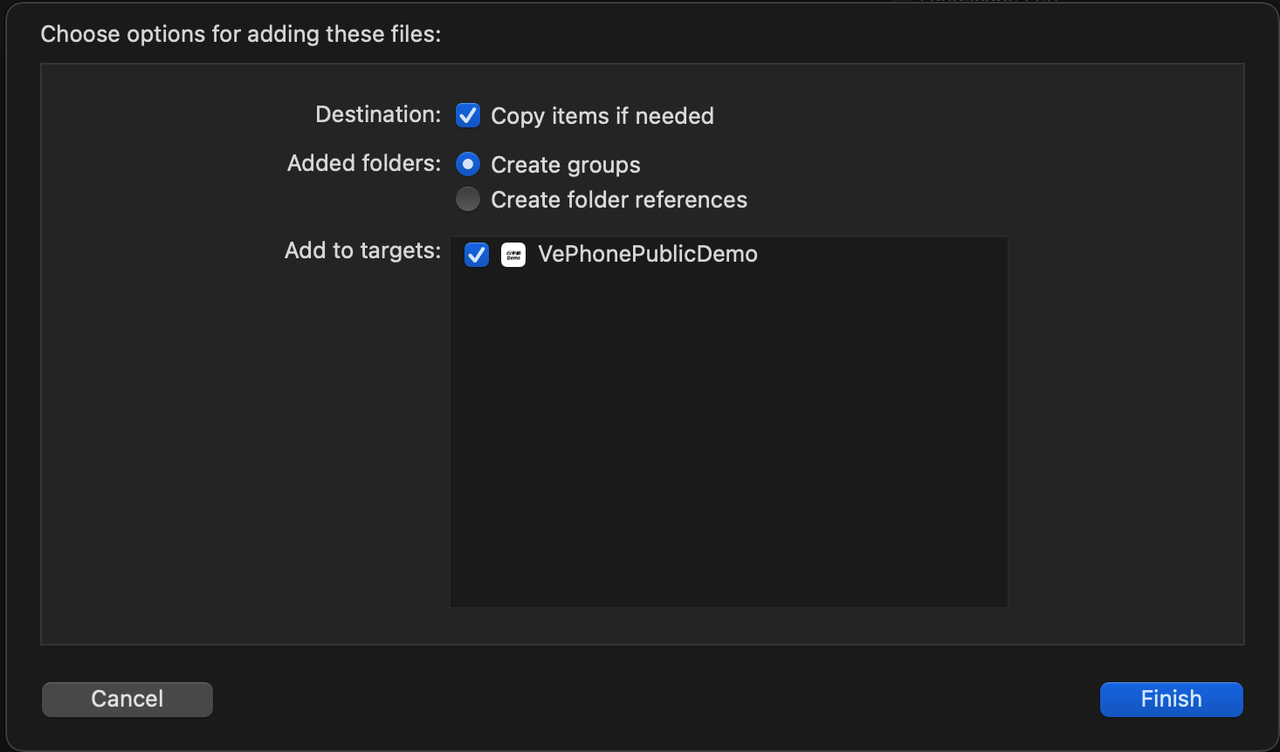 下载 vePhoneSDK 压缩包后,解压得到 VePhone.framework 和 VolcEngineRTC.framework 文件夹。手动将 VePhone.framework 和 VolcEngineRTC.framework 拖入目标工程,选择如下: