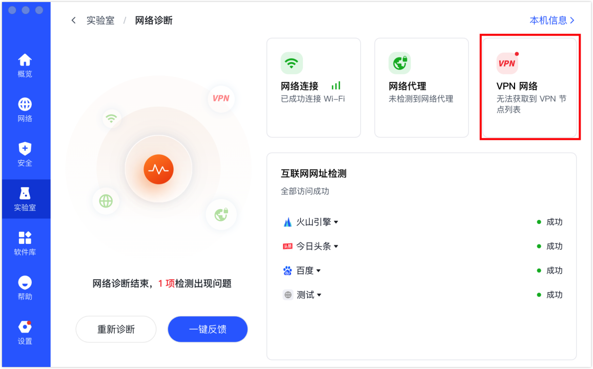 当遇到问题时,检测结果会告知异常情况。如 VPN 网络异常时,会收到无法获取到 VPN 节点列表的提示。使用者可根据提示自主修复或一键反馈。